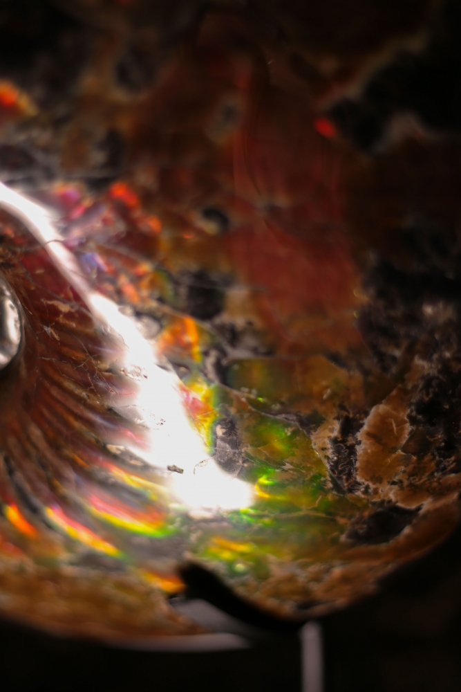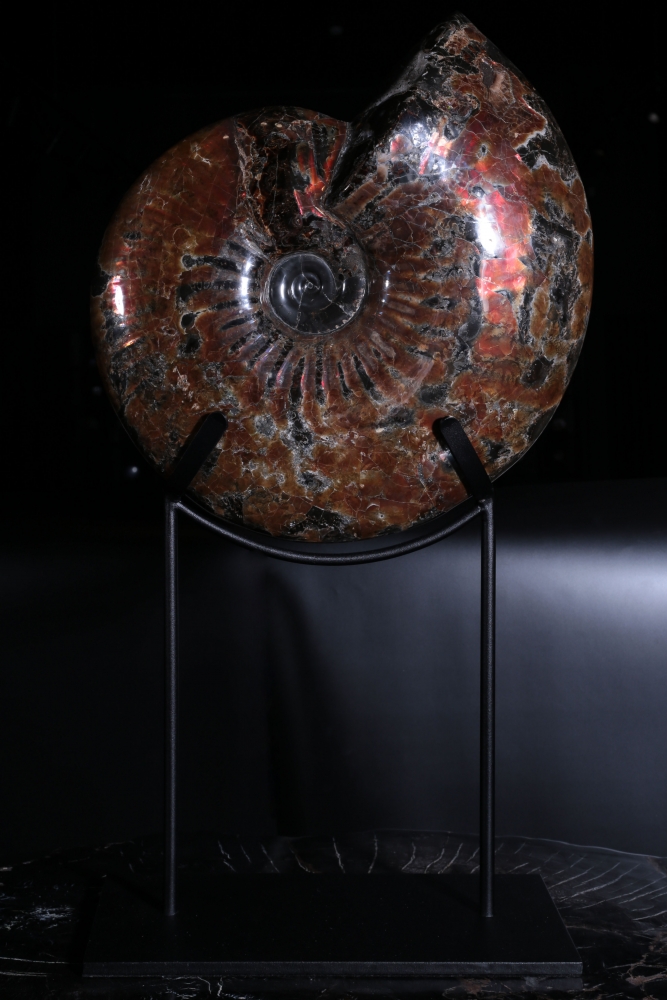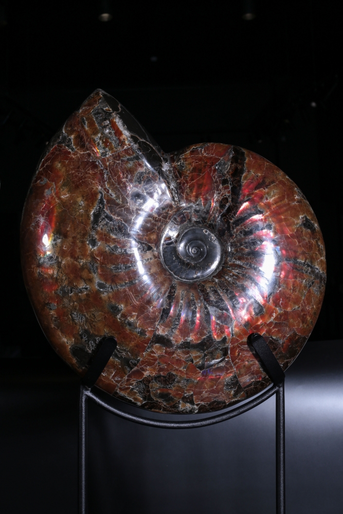 Аммонит окрашен в насыщенные каштановые и темно-красные цвета. Поменяйте угол освещения, и вы увидите, как загораются и гаснут багровые сполохи на поверхности раковины. Местами можно увидеть радужные переливы – это играет на свету окаменевший перламутр.