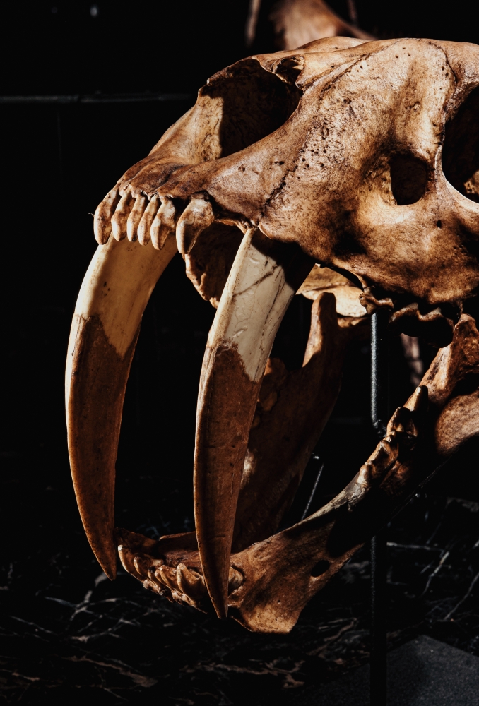 Эта отлично выполненная реплика черепа одного из самых крупных саблезубых хищников древности, смилодона. Смилодоны отличались мощным телосложением, чрезвычайно развитыми клыками и коротким массивным черепом, способным выдерживать огромные нагрузки при охоте. Вес взрослого животного мог доходить до 280 кг.