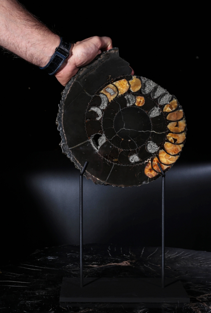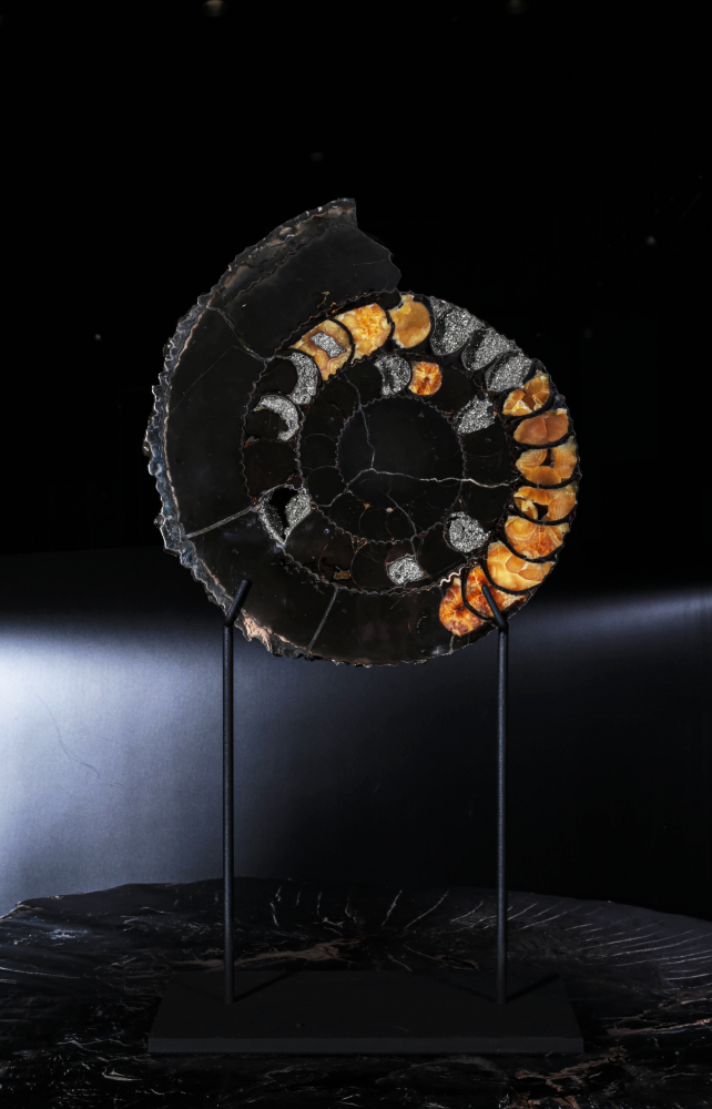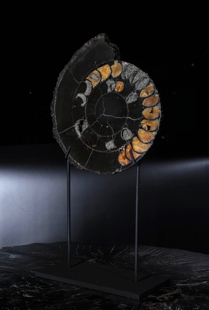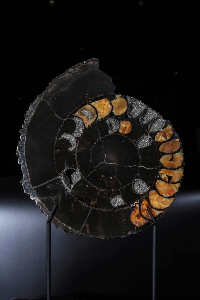 Раковины крупных аммонитов часто имеют красивое строение внутренних полостей. В отсеках, которые были пустыми при жизни моллюска, начинается рост относительно крупных кристаллов. Формируется жеода – каменный «карман», полость, заполненная кристаллами различных минералов. Если рост будет интенсивным, свободного места не останется и отсеки приобретут цвет и фактуру, отличающиеся от окружающего материала.