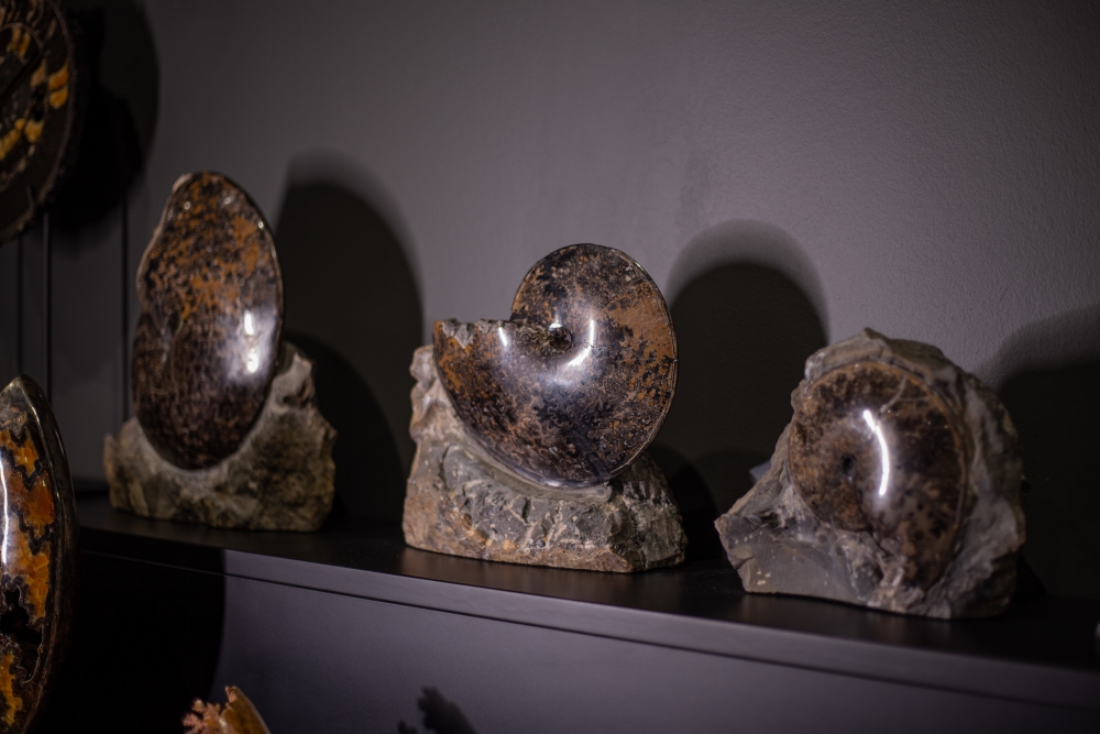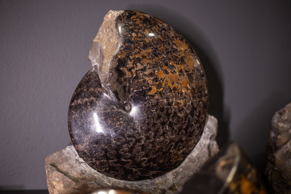 Раковина аммонита из Мексики впечатляет красотой и геометричностью. Её форма максимально сжатая, напоминающая спортивный снаряд – диск для метания, и только на месте жилой камеры можно видеть заметное утолщение. Не будь жилой камеры, и раковину можно было бы вписать в круг, настолько она идеальна. Поверхность аммонита покрыта листообразным узором, образованным лопастными линиями – стенками перегородок между отсеками раковины. Комплекс минералов, заместивших миллионы лет назад раковину моллюска, создал необычную окраску, сочетающую черные, серые и охристые участки. Этот аммонит, без сомнения, станет украшением вашего интерьера и хорошим пополнением палеонтологической коллекции.