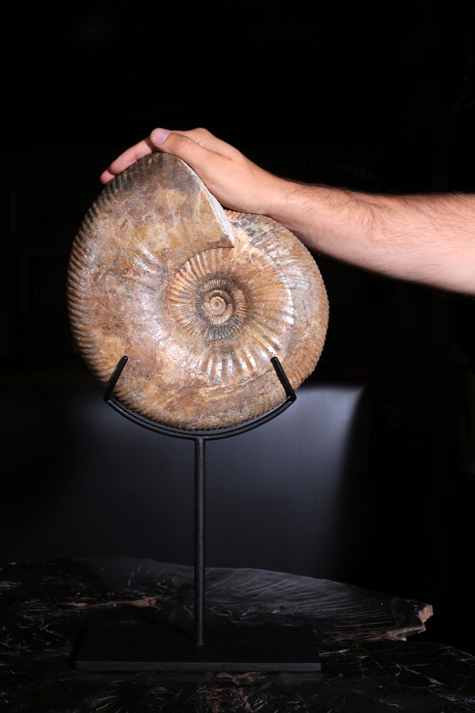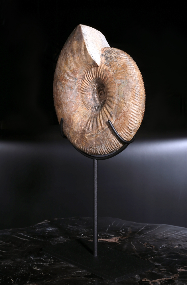 Природа воплотила в раковине, ставшей окаменелостью, такое соотношение частей и целого, которое человек позже откроет и назовёт золотым сечением. Спираль плавно расширяется, завораживая взгляд и создавая ощущение идеального равновесия. Тёплый персиковый оттенок раковины и лёгкий отблеск перламутра придают находке почти ювелирное очарование.