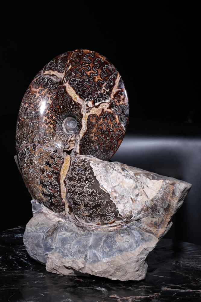 Раковина аммонита из Америки впечатляет красотой и геометричностью. Её форма максимально сжатая, напоминающая спортивный снаряд – диск для метания, и только на месте жилой камеры можно видеть заметное утолщение. Не будь жилой камеры, и раковину можно было бы вписать в круг, настолько она идеальна. Поверхность аммонита покрыта листообразным узором, образованным лопастными линиями – стенками перегородок между отсеками раковины. Комплекс минералов, заместивших миллионы лет назад раковину моллюска, создал необычную окраску, сочетающую черные, серые и охристые участки. Этот аммонит, без сомнения, станет украшением вашего интерьера и хорошим пополнением палеонтологической коллекции.