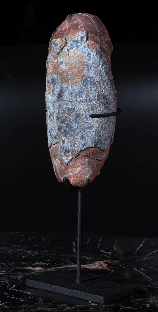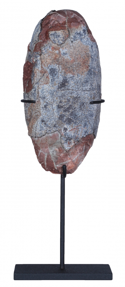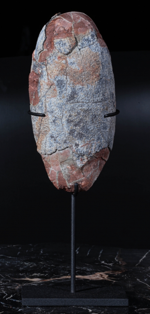 Яйцо вытянутое, овальной формы. Внутреннее каменное ядро, образовавшееся в результате заполнения яйца осадочным материалом, покрыто окаменевшей скорлупой. Хорошо заметен рельеф скорлупы - многочисленные бугорки, образующие подобие продольных линий. Скорлупа разделена трещинами на крупные блоки, имеющие хорошую сохранность.