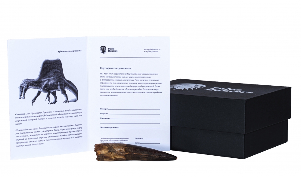 В стоимость включена стильная черная коробка с фирменным логотипом компании Paleo Hunters. Специальный наполнитель убережет вашу покупку от повреждений. К коробке прилагается конверт с сургучной печатью нашего логотипа, внутрь которого помещен сертификат, подтверждающий подлинность образца.