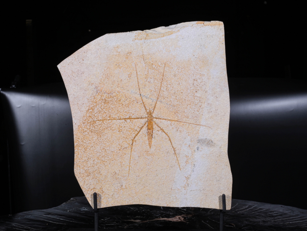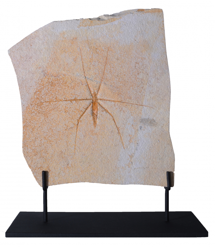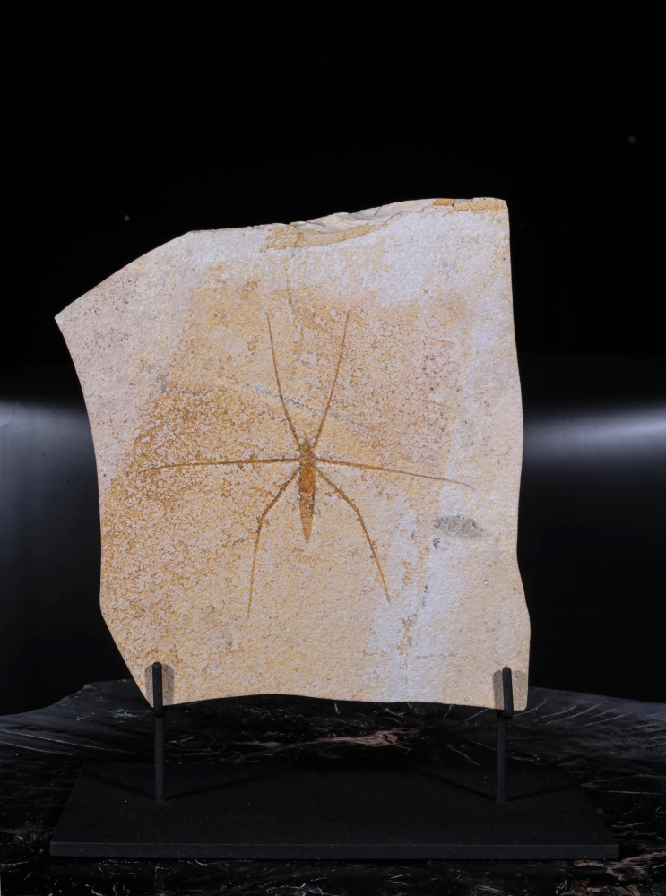 Окаменелость поражает степенью сохранности: видны контуры тела, членистые тонкие ноги. Светлый известняк подчёркивает хрупкую архитектуру силуэта, превращая окаменелость в произведение геологического искусства.