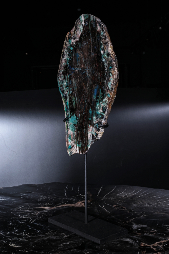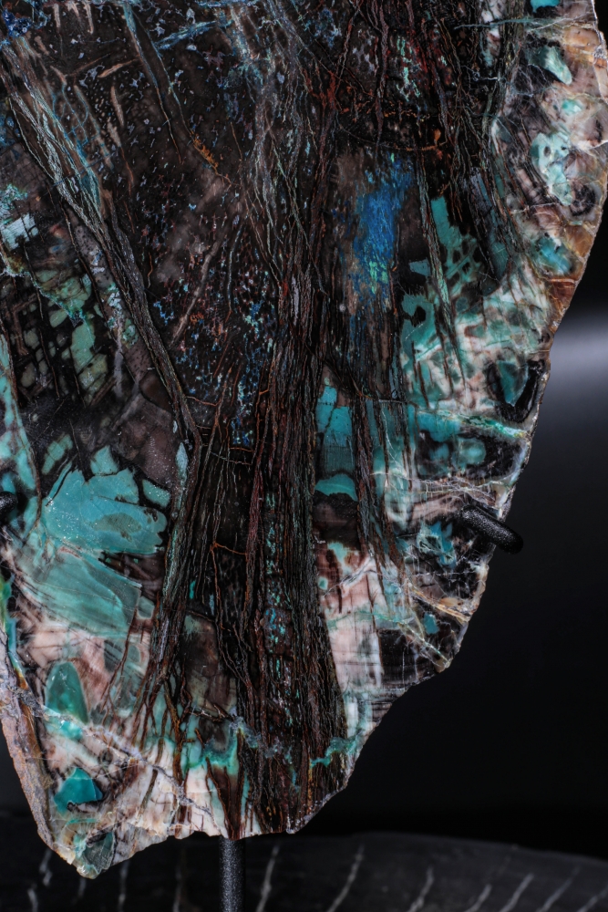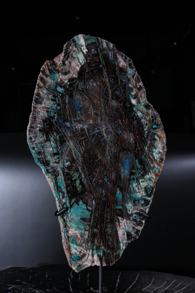 Перед вами спил окаменевшего дерева, относящегося к категории Colla wood: так называют древесину, чьи ткани полностью замещены соединениями меди. Классифицировать дерево в таком случае уже невозможно из-за особенностей фоссилизации. Зато можно наслаждаться его необыкновенной красотой.