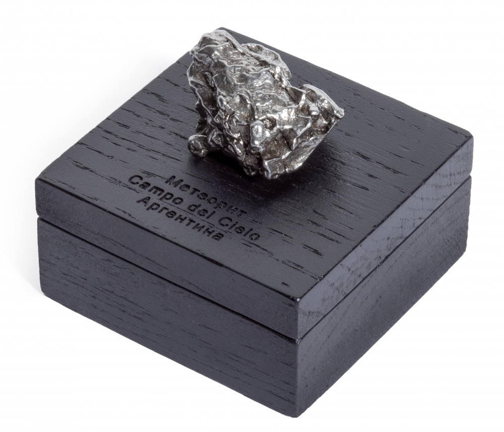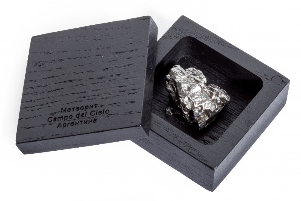 К метеориту прилагается шкатулка из дерева черного цвета. На крышке шкатулки вырезано название метеорита. Шкатулку можно использовать как для хранения, так и в качестве подставки для демонстрации образца.