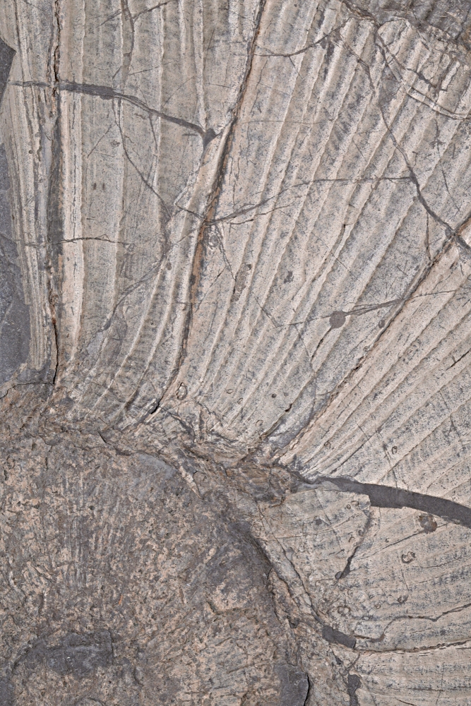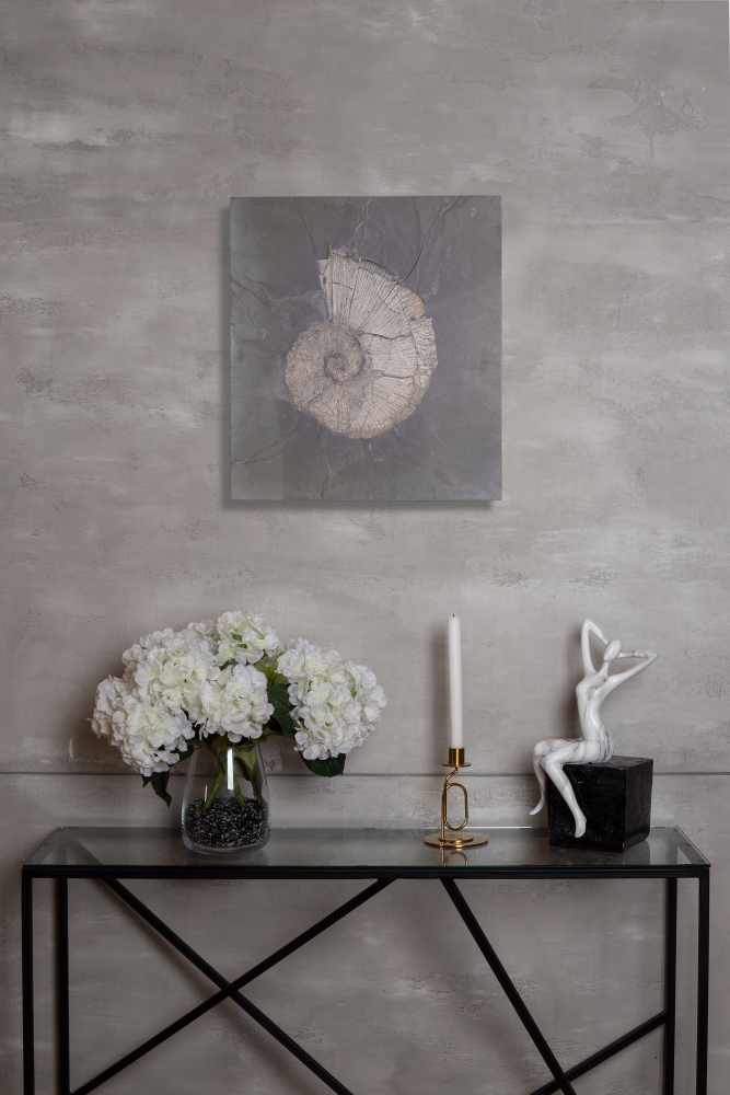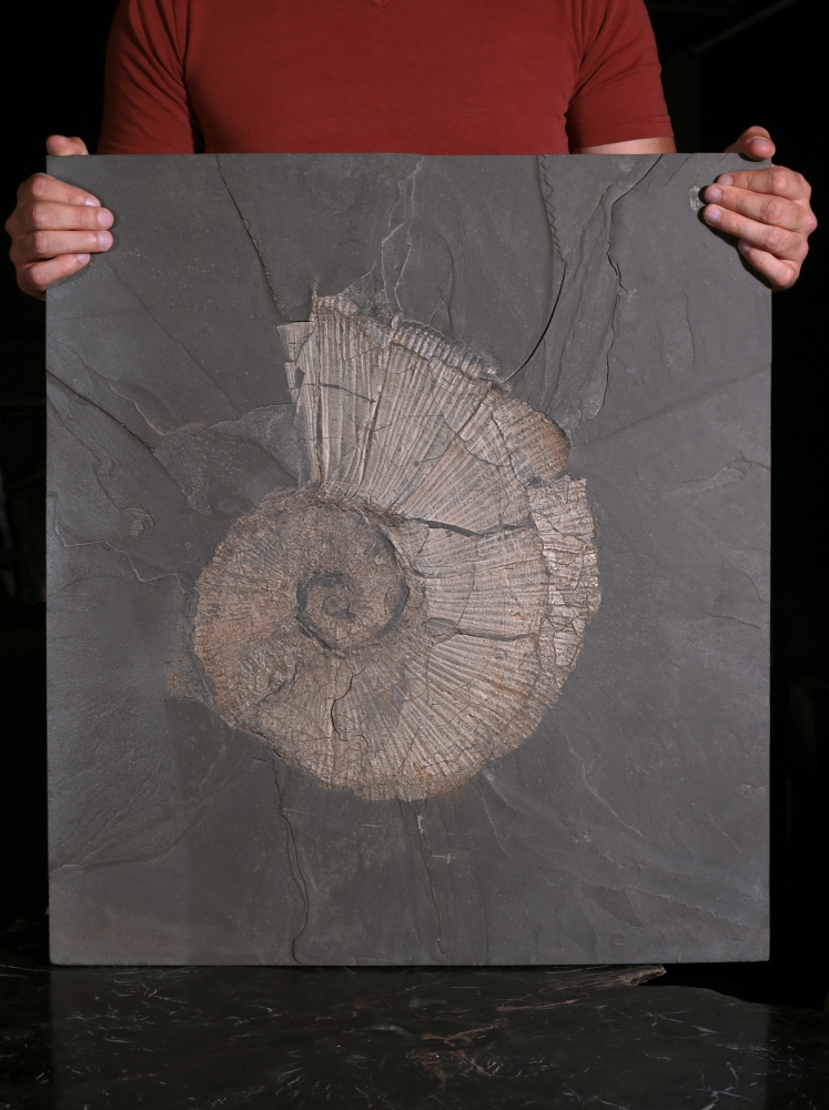 Этот аммонит родом из Хольцмадена – обитатель юрских морей, живший 180 миллионов лет назад. Плоский, как и большинство хольцмаденских аммонитов, он удобно расположен в прямоугольном сланцевом «панно».