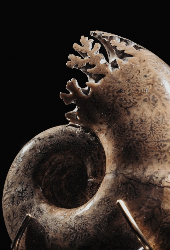 Великолепный аммонит Lytoceras выглядит как украшение бога морей, Посейдона. Не смотря на некоторую массивность раковины, эти головоногие были отличными пловцами и охотились в толще морских вод долгое время – с юрского по меловой периоды. Крупные тяжеловесные завитки раковины несут узор из светлых поперечных участков и древовидных лопастных линий. Цвет раковины гармонично меняется от коричневых до оливковых цветов.