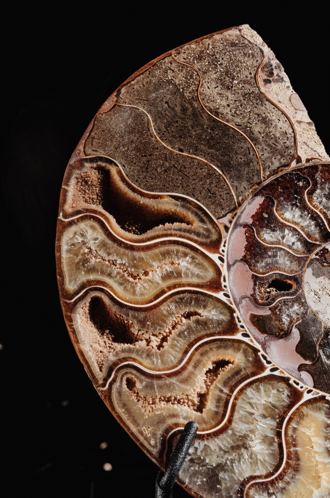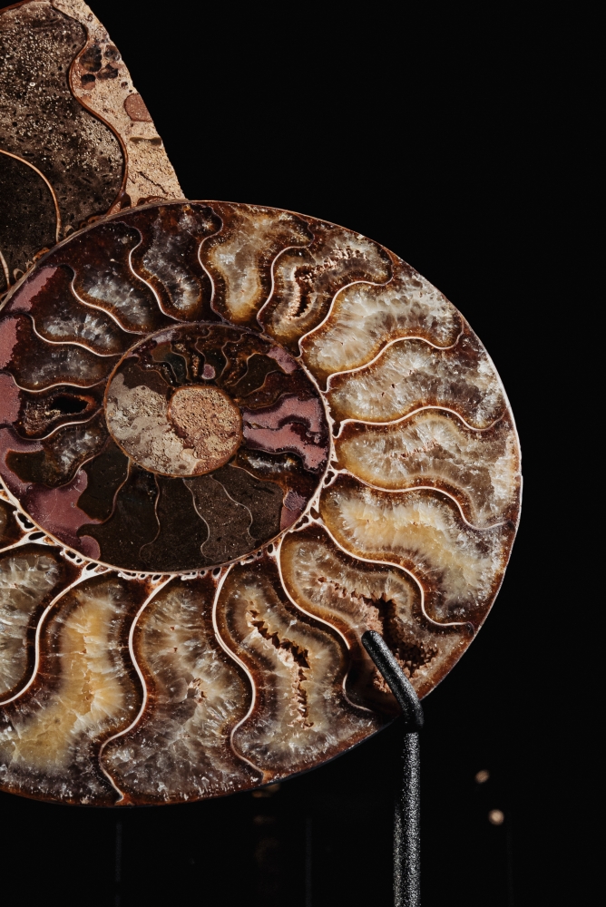 Их раковины были замещены кальцитом, способным окрашиваться в самые невероятные цвета под действием прочих минералов. Основной цвет мадагаскарских аммонитов – янтарно-рыжий, но поверх него накладывается листообразный узор лопастных линий. Раковины становятся похожи на произведения искусства, покрытые затейливым орнаментом. Установленные на изящную подставку, они отлично впишутся в ваш интерьер.
