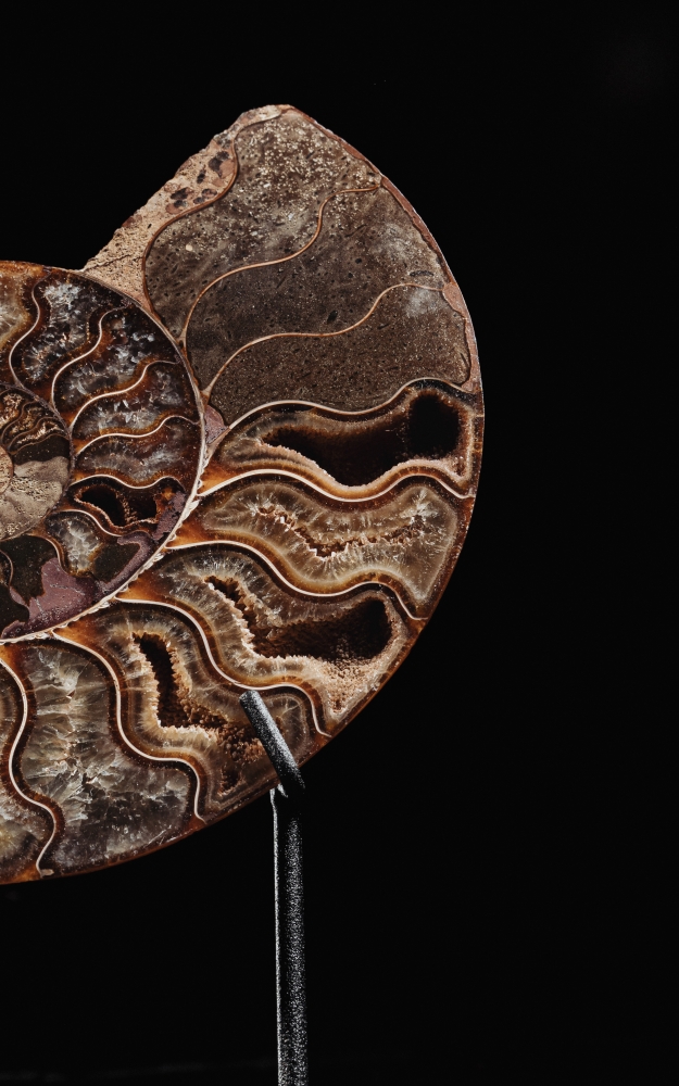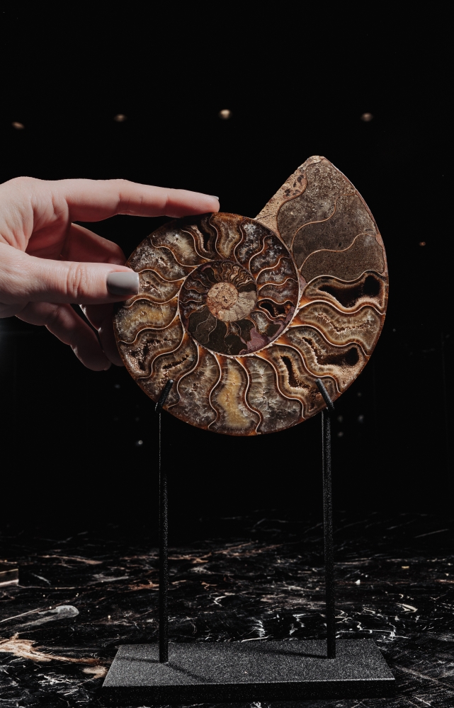 Их раковины были замещены кальцитом, способным окрашиваться в самые невероятные цвета под действием прочих минералов. Основной цвет мадагаскарских аммонитов – янтарно-рыжий, но поверх него накладывается листообразный узор лопастных линий. Раковины становятся похожи на произведения искусства, покрытые затейливым орнаментом. Установленные на изящную подставку, они отлично впишутся в ваш интерьер.