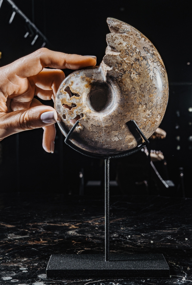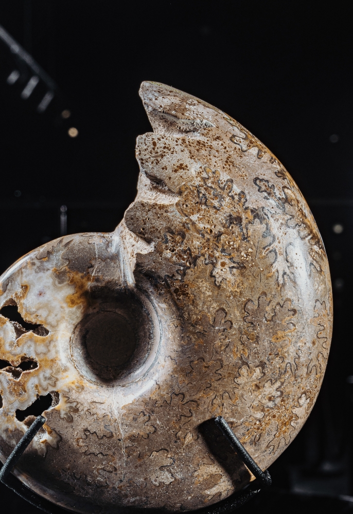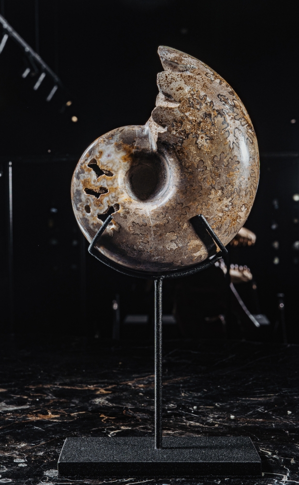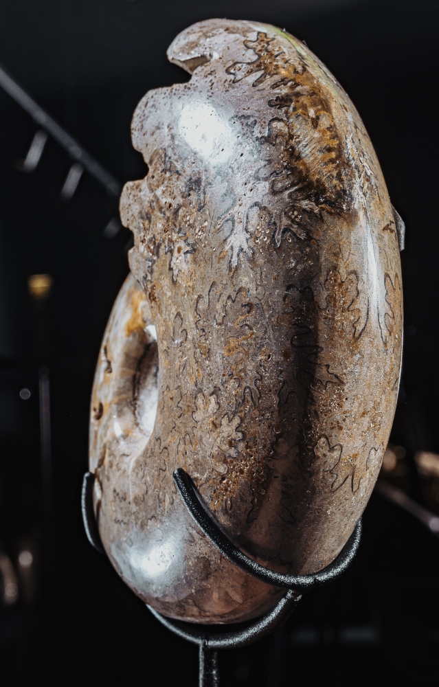 Сейчас внутренняя поверхность отсеков покрыта корочками из кристаллического кальцита. Сочетание внутренних полостей, извилистых отверстий и узоров придает аммониту совершенно фантастический вид.