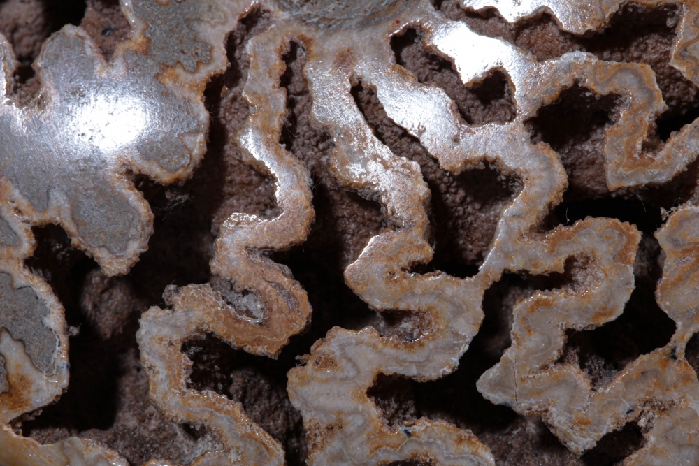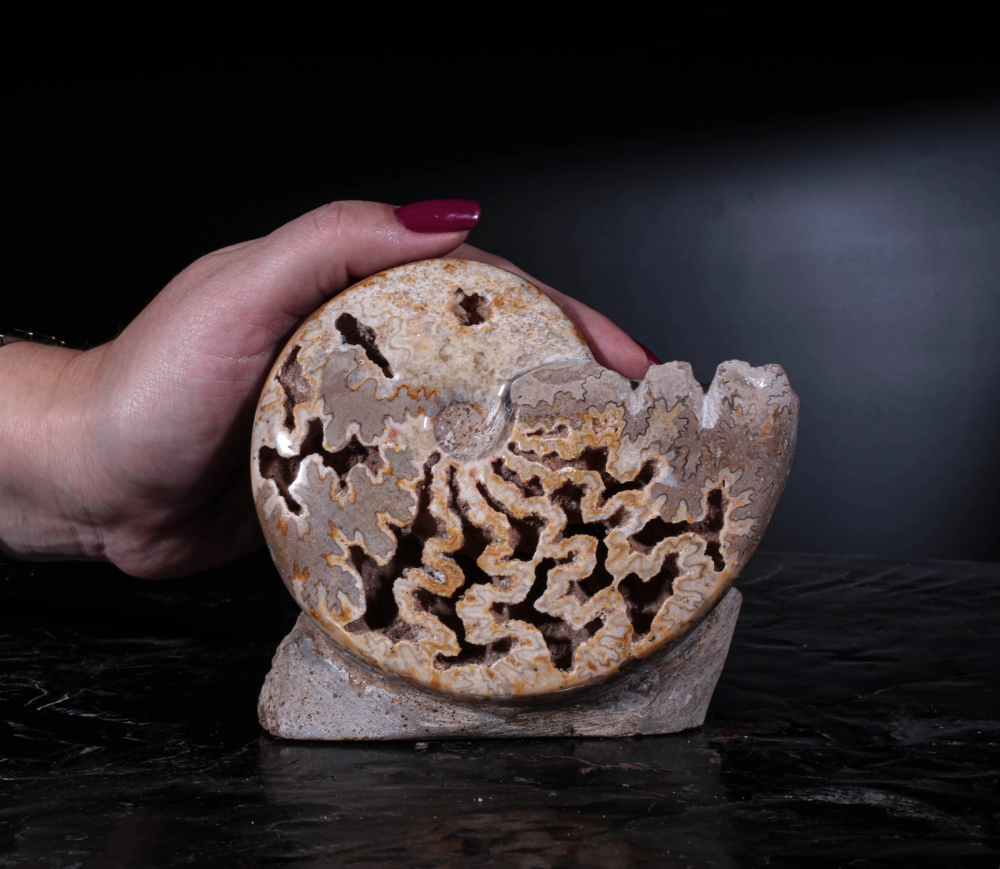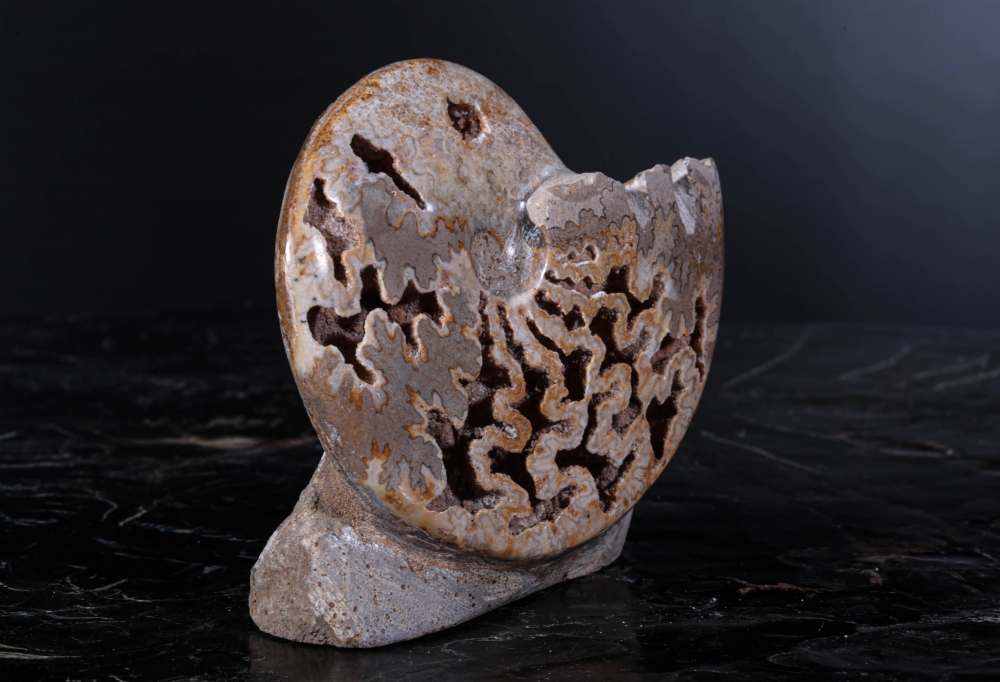 Сейчас внутренняя поверхность отсеков покрыта корочками из кристаллического кальцита. Сочетание внутренних полостей, извилистых отверстий и узоров придает аммониту совершенно фантастический вид.