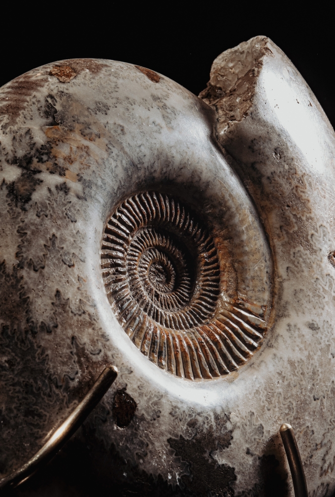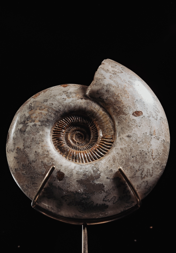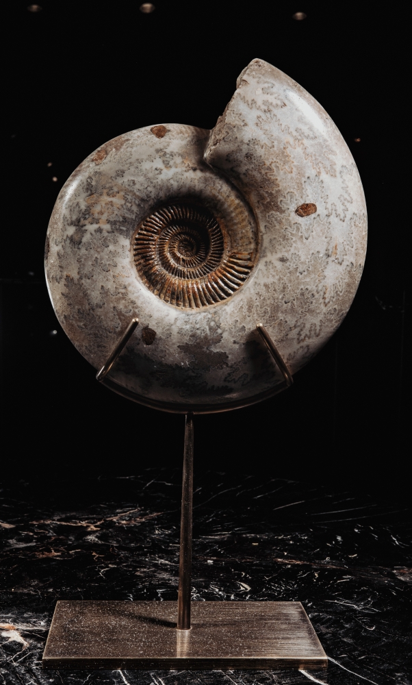 Аммонит Parkinsonia parkinson прекрасен сам по себе, но ещё интереснее – в интерьере. Установленный на подставку, он становится центром всей композиции, эффектно сочетаясь с книгами и раритетными артефактами. Это не просто окаменелость, но отголосок древней истории нашей планеты, сохраняющий красоту эпохи динозавров.