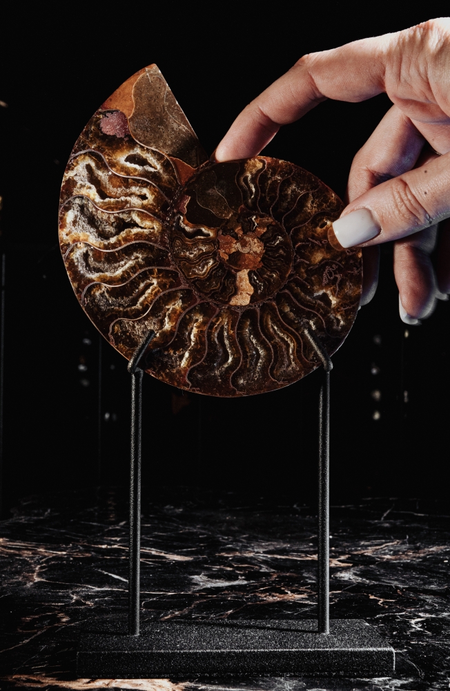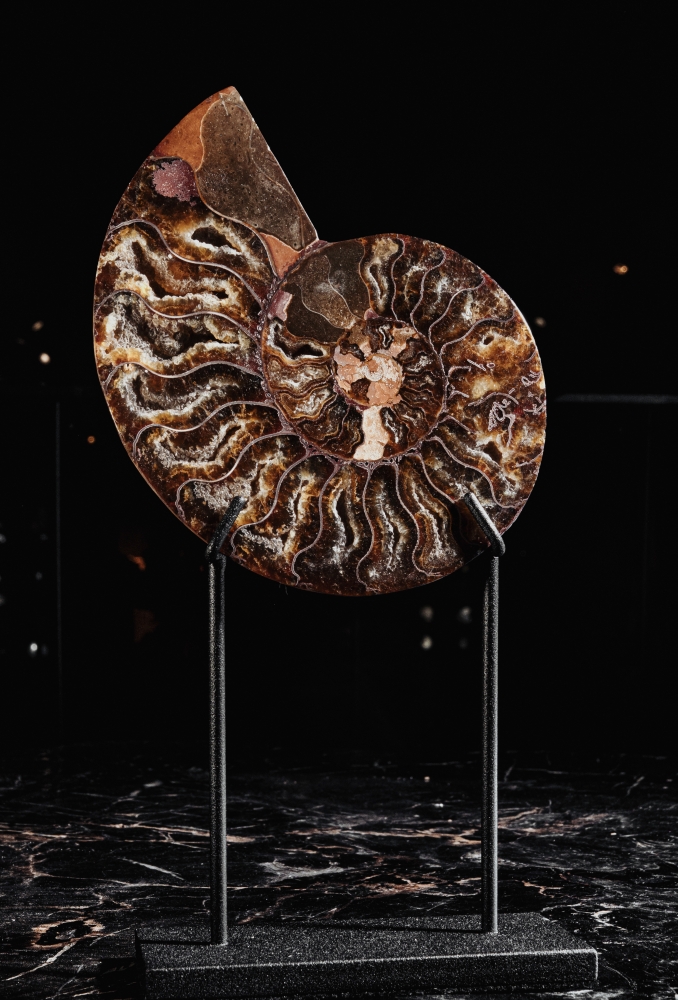Их раковины были замещены кальцитом, способным окрашиваться в самые невероятные цвета под действием прочих минералов. Основной цвет мадагаскарских аммонитов – янтарно-рыжий, но поверх него накладывается листообразный узор лопастных линий. Раковины становятся похожи на произведения искусства, покрытые затейливым орнаментом. Установленные на изящную подставку, они отлично впишутся в ваш интерьер.