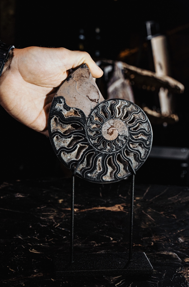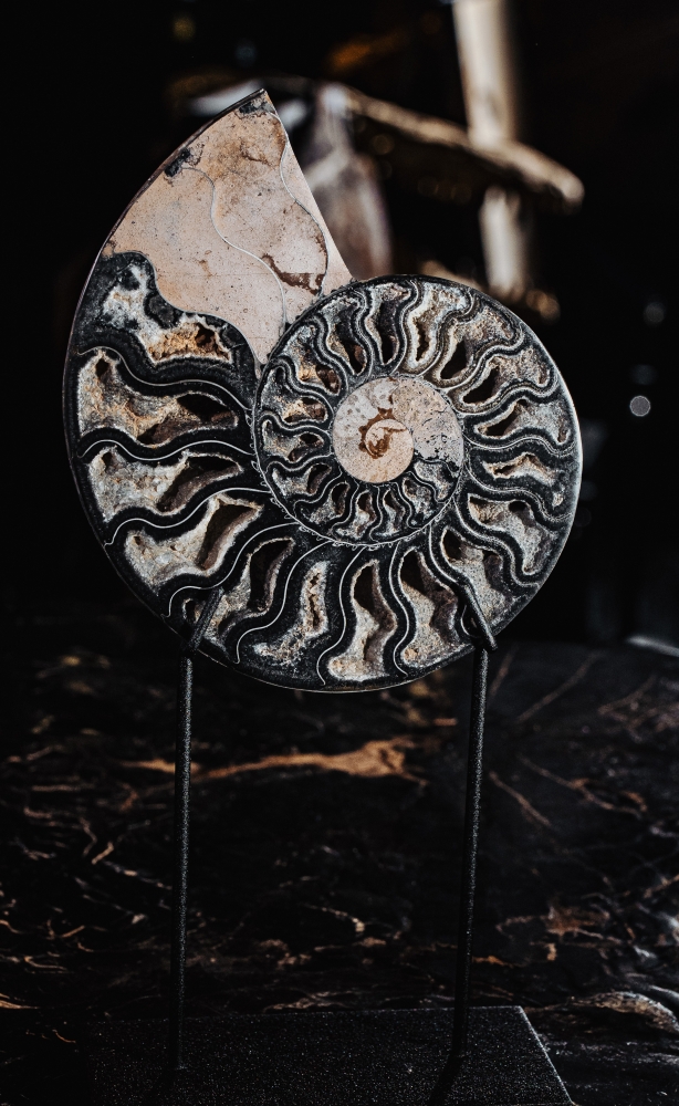 Их раковины были замещены кальцитом, способным окрашиваться в самые невероятные цвета под действием прочих минералов. Основной цвет мадагаскарских аммонитов – янтарно-рыжий, но поверх него накладывается листообразный узор лопастных линий. Раковины становятся похожи на произведения искусства, покрытые затейливым орнаментом. Установленные на изящную подставку, они отлично впишутся в ваш интерьер.