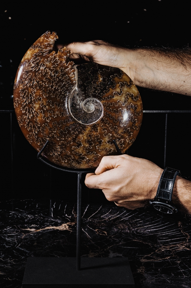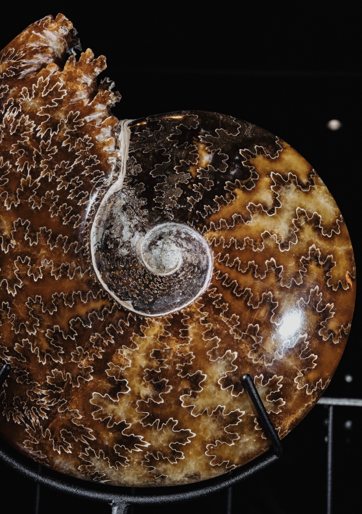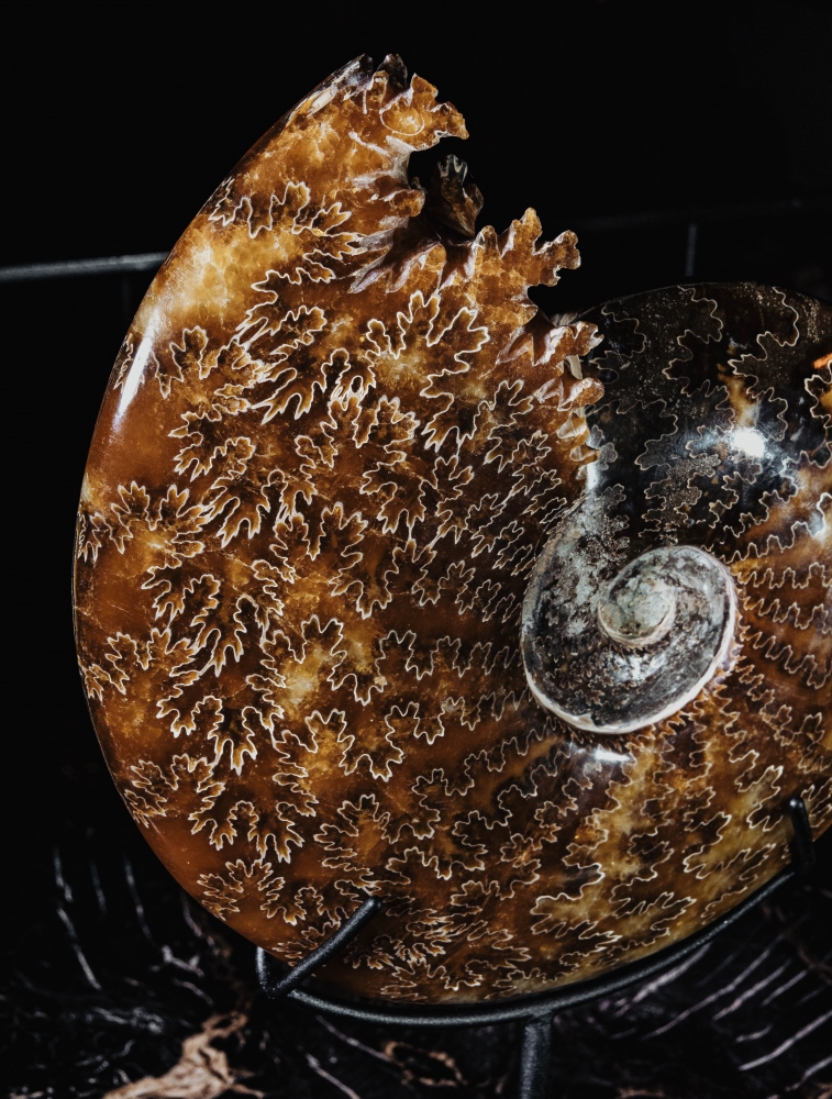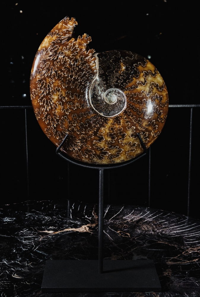 Узор на поверхности раковины образован лопастными линиями. В этих местах внутренние перегородки соединялись с внешними стенками раковины аммонита. Раковина по большей части замещена кальцитом, имеющим теплую, приятную окраску.