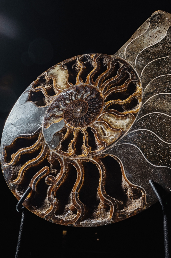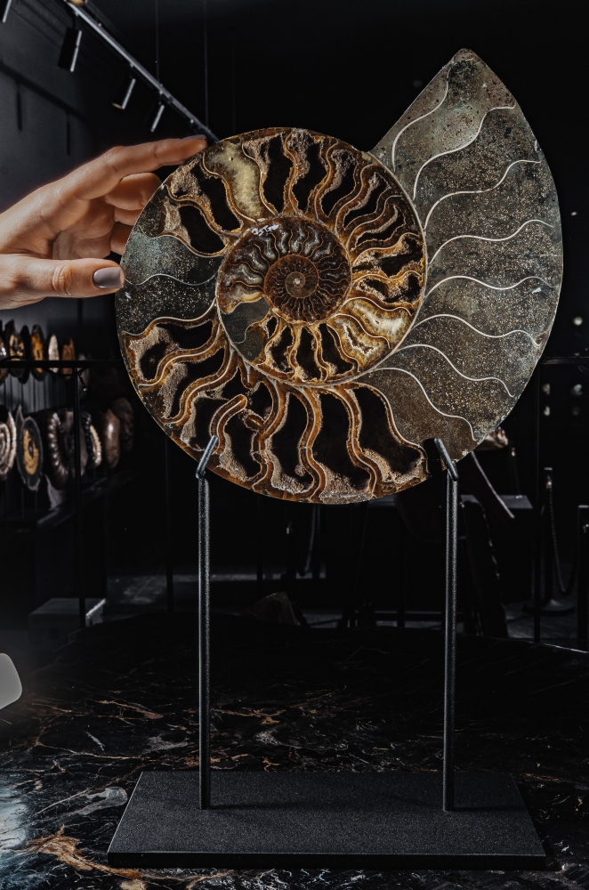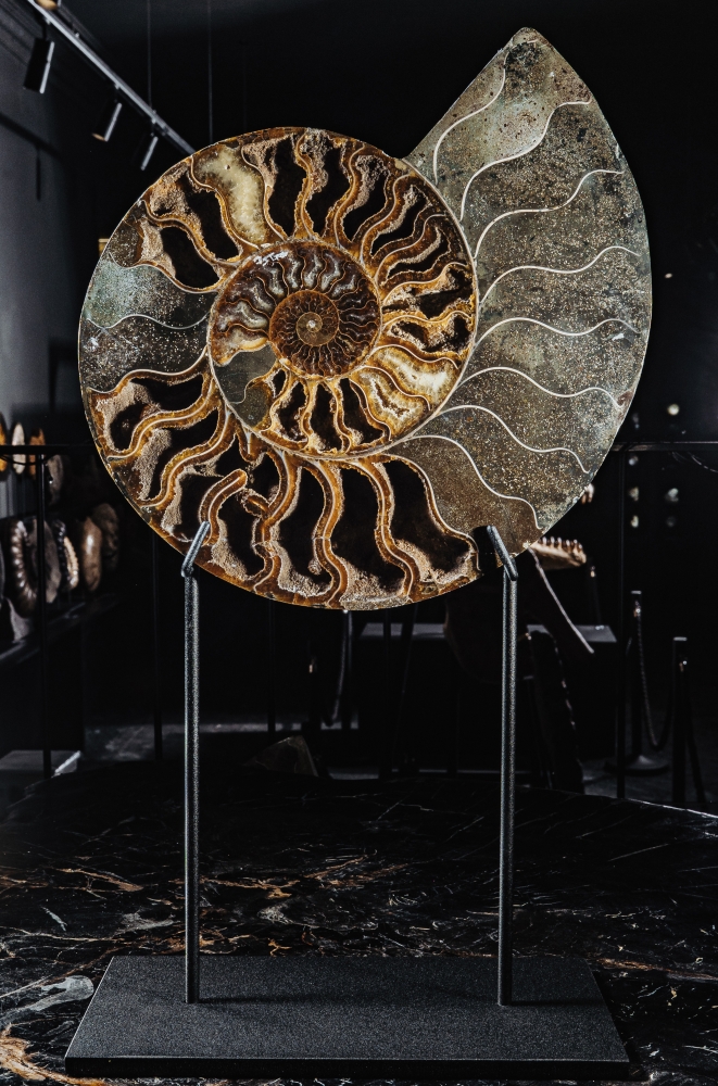 Распиленный пополам аммонит демонстрирует строгие, математически выверенные природой пропорции раковины моллюска, сочетающиеся с невероятными по красоте кальцитовыми жеодами, в которые превратились его внутренние полости. Не менее примечательны и потрясающие цвета, открывающиеся нашему взору.