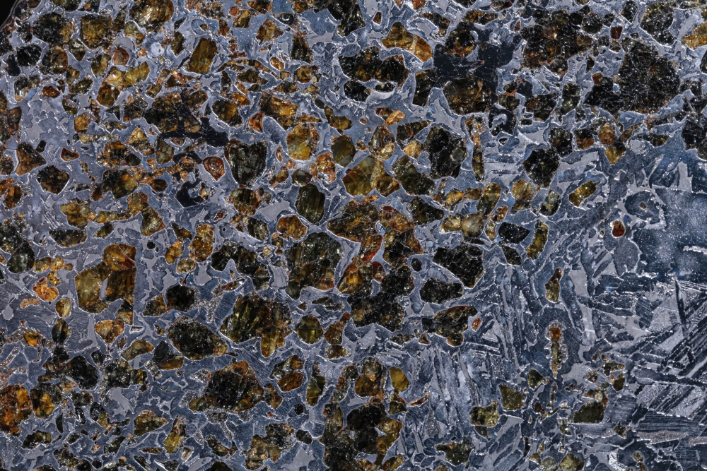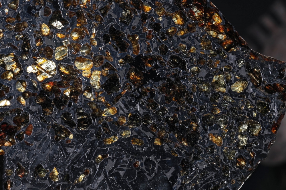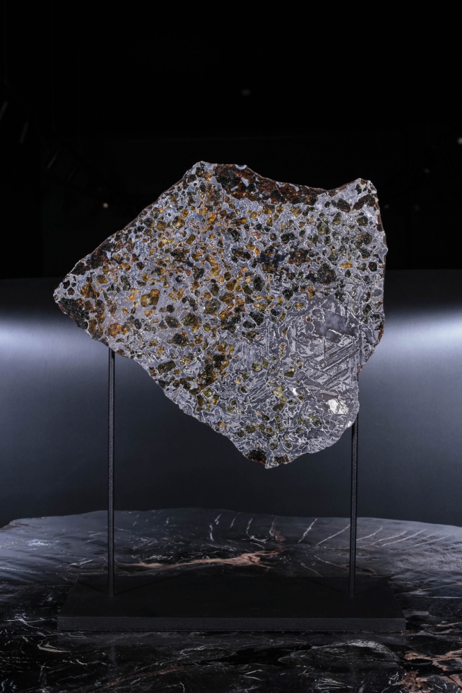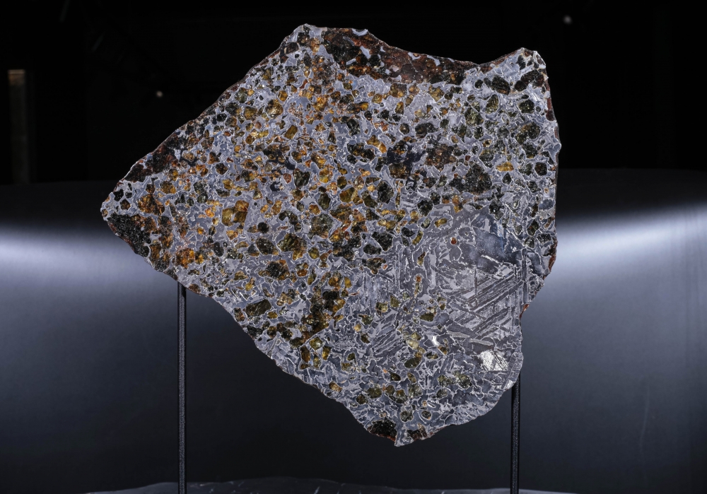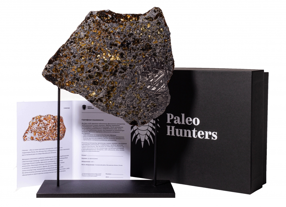 Пластина метеорита Сеймчан, относящегося к редкому классу палласитов. Его необычная структура образована сложным соединением железной матрицы и золотистых кристаллов оливина. На металлических участках можно заметить узор из видманштеттеновых линий. Это следы кристаллизации металла в условиях космоса. Красота пластинки метеорита особенно заметна на свету, когда яркие блики переливаются в оранжево-желтых оливиновых включениях.