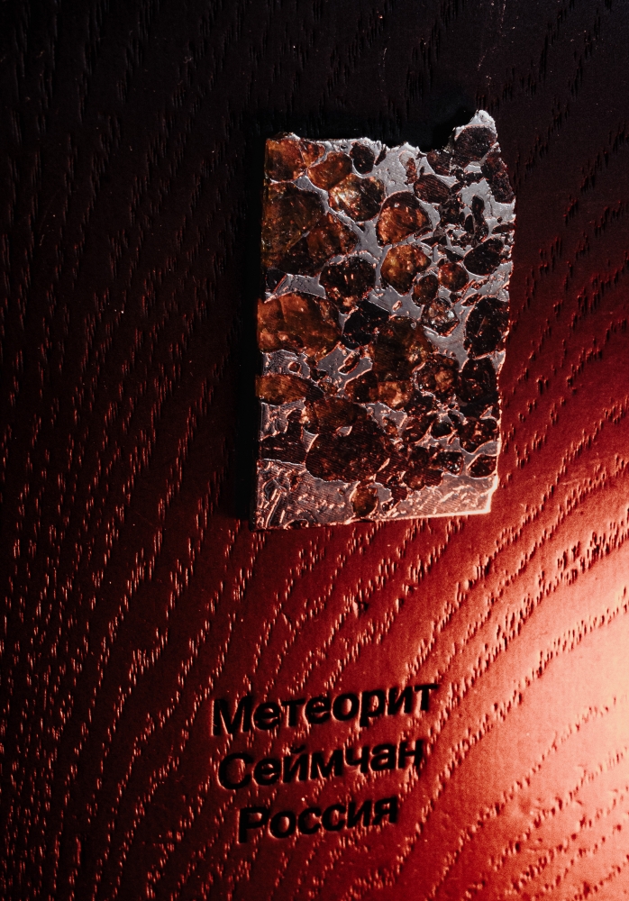 Пластина метеорита Сеймчан, относящегося к редкому классу палласитов. Его необычная структура образована сложным соединением железной матрицы и золотистых кристаллов оливина. На металлических участках можно заметить узор из видманштеттеновых линий. Это следы кристаллизации металла в условиях космоса. Красота пластинки метеорита особенно заметна на свету, когда яркие блики переливаются в оранжево-желтых оливиновых включениях.