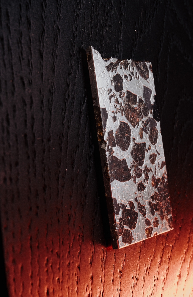 Пластина метеорита Сеймчан, относящегося к редкому классу палласитов. Его необычная структура образована сложным соединением железной матрицы и золотистых кристаллов оливина. На металлических участках можно заметить узор из видманштеттеновых линий. Это следы кристаллизации металла в условиях космоса. Красота пластинки метеорита особенно заметна на свету, когда яркие блики переливаются в оранжево-желтых оливиновых включениях.