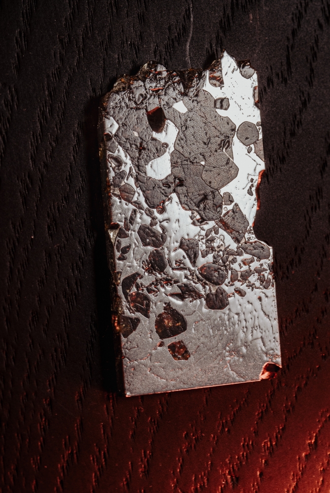 Пластина метеорита Сеймчан, относящегося к редкому классу палласитов. Его необычная структура образована сложным соединением железной матрицы и золотистых кристаллов оливина. На металлических участках можно заметить узор из видманштеттеновых линий. Это следы кристаллизации металла в условиях космоса. Красота пластинки метеорита особенно заметна на свету, когда яркие блики переливаются в оранжево-желтых оливиновых включениях.