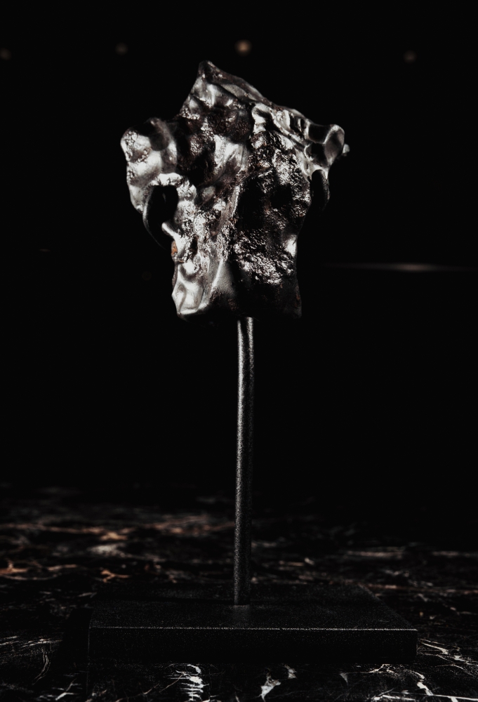 Фрагмент метеорита имеет углубления, называемые регмаглиптами. Они образуются во время прохождения метеоритом атмосферы в результате сверления потоком воздуха. Такие фрагменты называются индивидуальными, образуются при разрушении космического тела в атмосфере и выпадают на землю в виде метеоритного дождя.