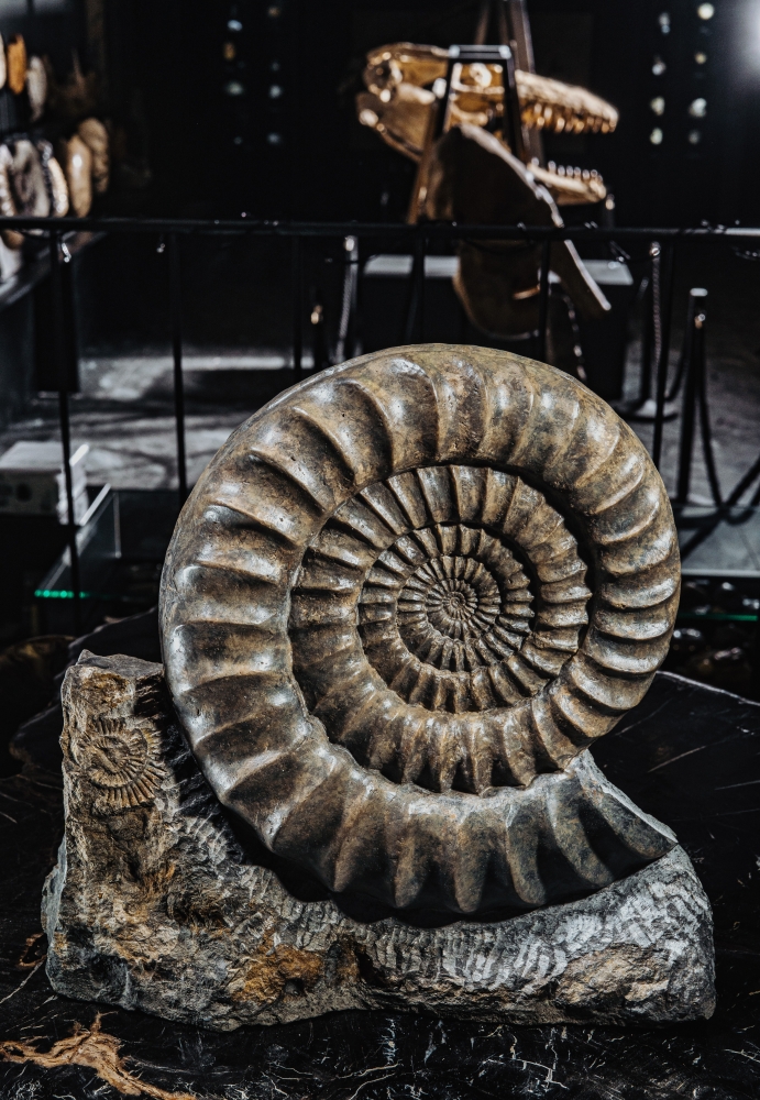 После едва не уничтожившего их вымирания, аммониты быстро оправились и смогли достичь крупных размеров. Диаметр раковины нашего образца 54 см, а вес 56 кг! При жизни диаметр был несколько больше (не вся раковина сохранилась), а вот весил аммонит намного меньше. Отсеки внутри раковины были заполнены водой и углекислым газом, придававшим ему нейтральную плавучесть, что делало аммонита походим на подводную лодку.
