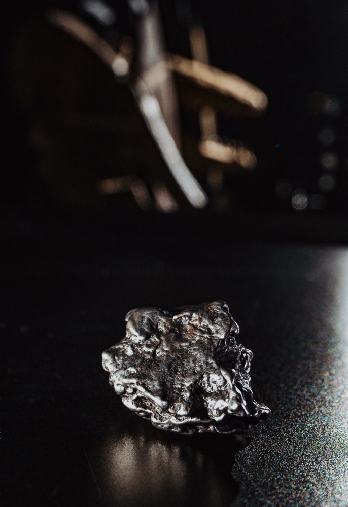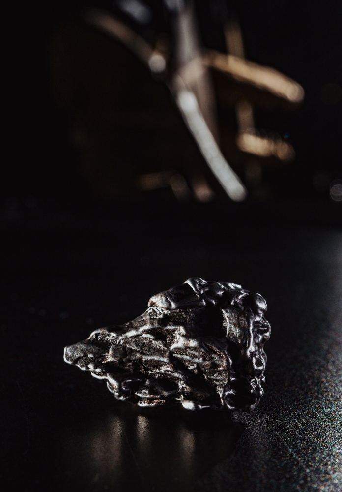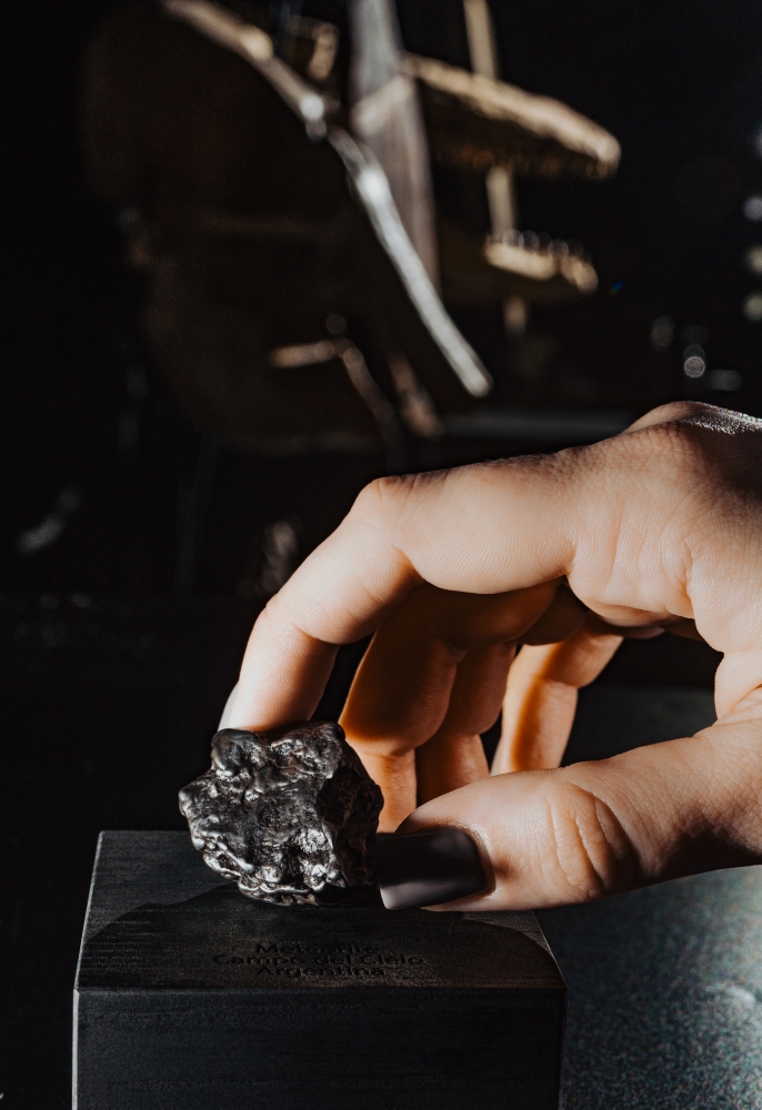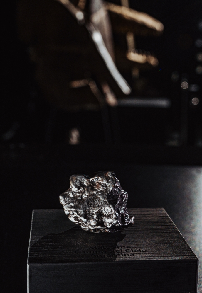 Образец метеорита Campo del Cielo, обнаруженного на севере Аргентины еще в XVI веке, являющего одним из самых крупных когда-либо обнаруженных метеоритов. Представляет собой фрагмент неправильной формы со сложным рельефом.