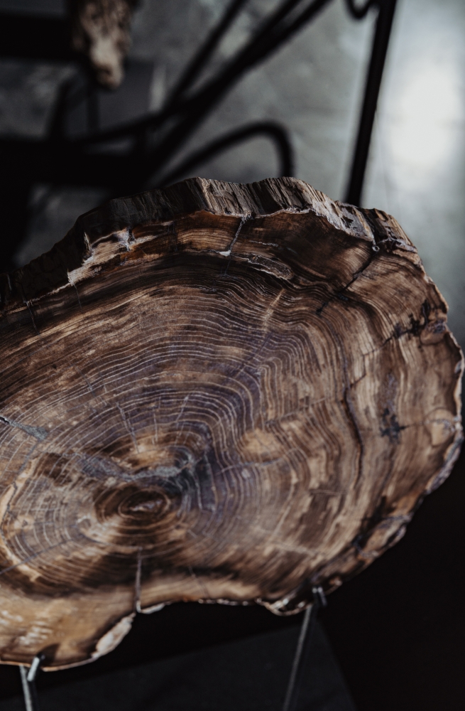 На спиле хорошо видна плотная структура древесины с огромным количеством годовых колец. Очевидно, дерево прожило не один десяток лет. Интересная деталь – смещенная к одному краю сердцевина. Такое происходит, когда дерево растет на склоне, искривляется под действием ветра и иных сил природы.