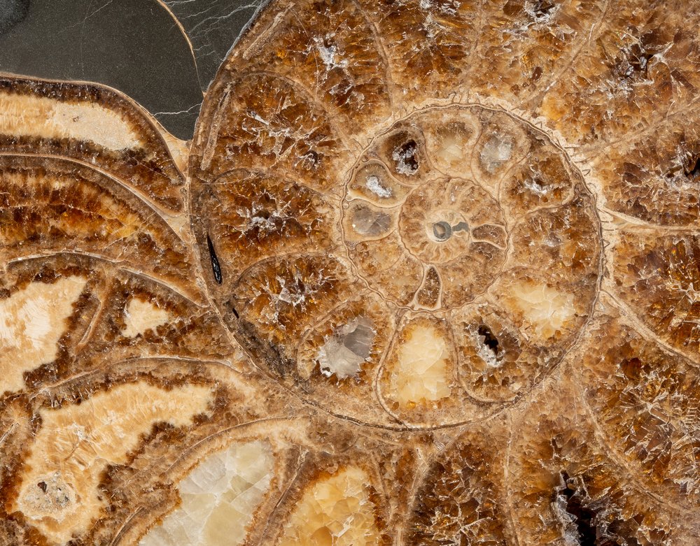 Обычно раковины аммонитов замещаются таким минералом, как кальцит. Во внутренних отсеках раковины образуются кальцитовые жеоды с крупными кристаллами, иногда заполняющие всю полость. Благодаря примесям других минералов кальцит окрашивается в теплые оттенки песочного и кофейного цветов.