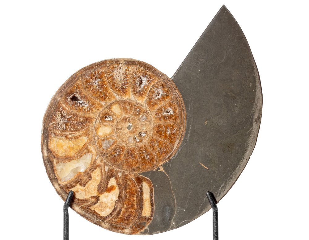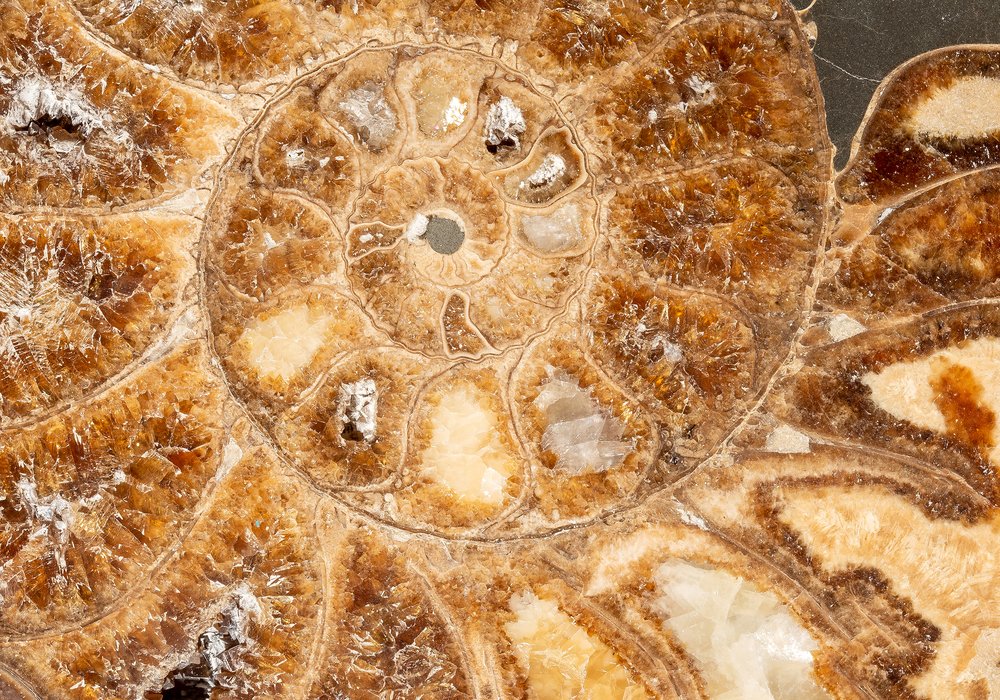 Обычно раковины аммонитов замещаются таким минералом, как кальцит. Во внутренних отсеках раковины образуются кальцитовые жеоды с крупными кристаллами, иногда заполняющие всю полость. Благодаря примесям других минералов кальцит окрашивается в теплые оттенки песочного и кофейного цветов.