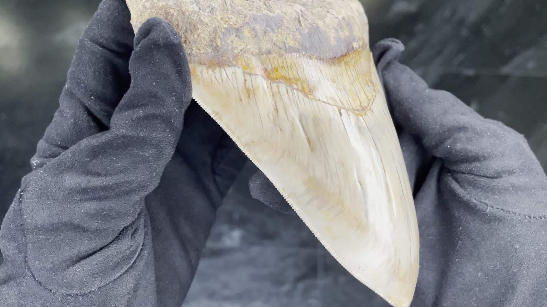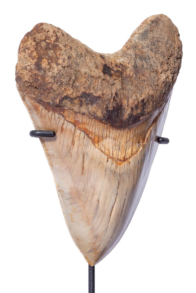 Этот зуб неспроста получил статус образца музейного качества. Крупные размеры и массивность уже привлекают внимание. Сохранность практически идеальная. Поверхность зуба не несет никаких повреждений. Пилообразная кромка не содержит дефектов. В довершение картины – окраска, придающая зубу эстетическую привлекательность.
