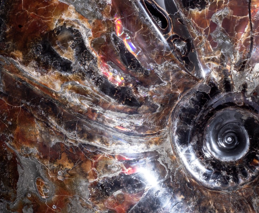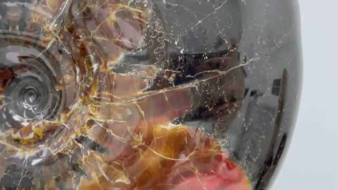 Аммонит окрашен в насыщенные каштановые и темно-красные цвета. Поменяйте угол освещения, и вы увидите, как загораются и гаснут багровые сполохи на поверхности раковины. Местами можно увидеть радужные переливы – это играет на свету окаменевший перламутр.