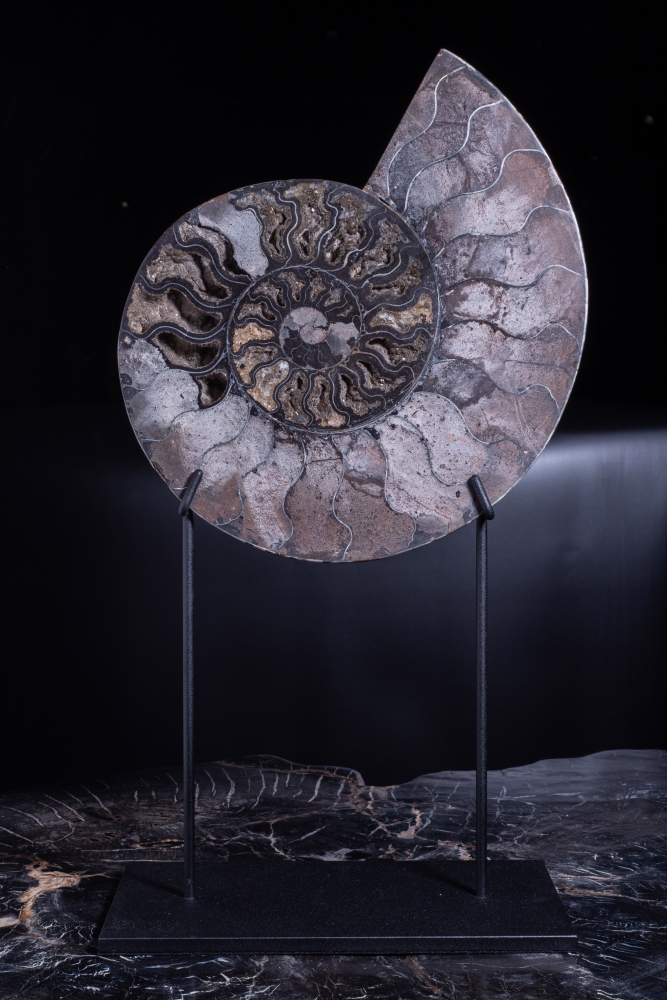 Распиленный пополам аммонит демонстрирует строгие, математически выверенные природой пропорции раковины моллюска, сочетающиеся с невероятными по красоте кальцитовыми жеодами, в которые превратились его внутренние полости. Не менее примечательны и потрясающие цвета, открывающиеся нашему взору.