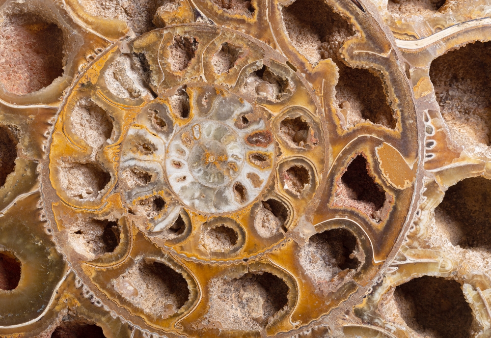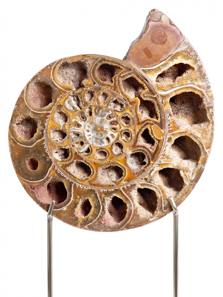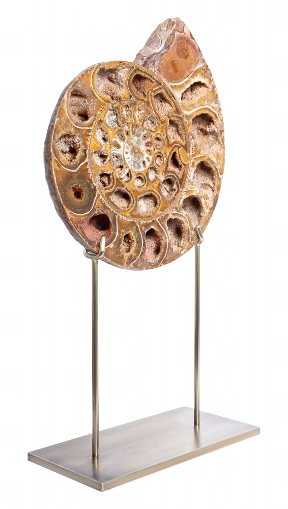 Perisphinctes род аммонитов, населявших моря в юрском периоде, в эпоху расцвета динозавров и морских рептилий. Для мадагаскарских аммонитов характерно замещение кальцитом с примесями других минералов. В результате аммонит окрашивается в целый спектр желтых, бежевых и оранжевых тонов. Если отсеки в раковине не были заполнены илом или песком, то в процессе окаменения в них начинается рост кристаллов, и это хорошо видно на данном образце.