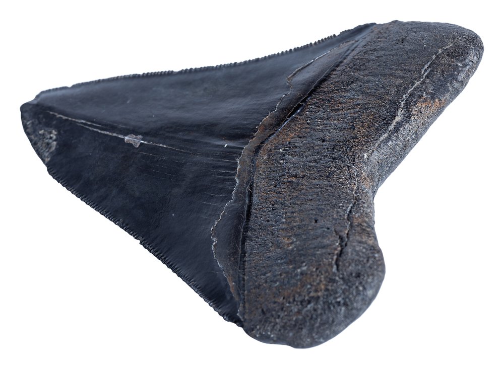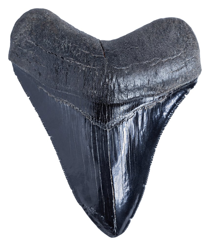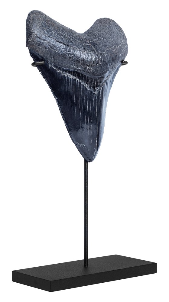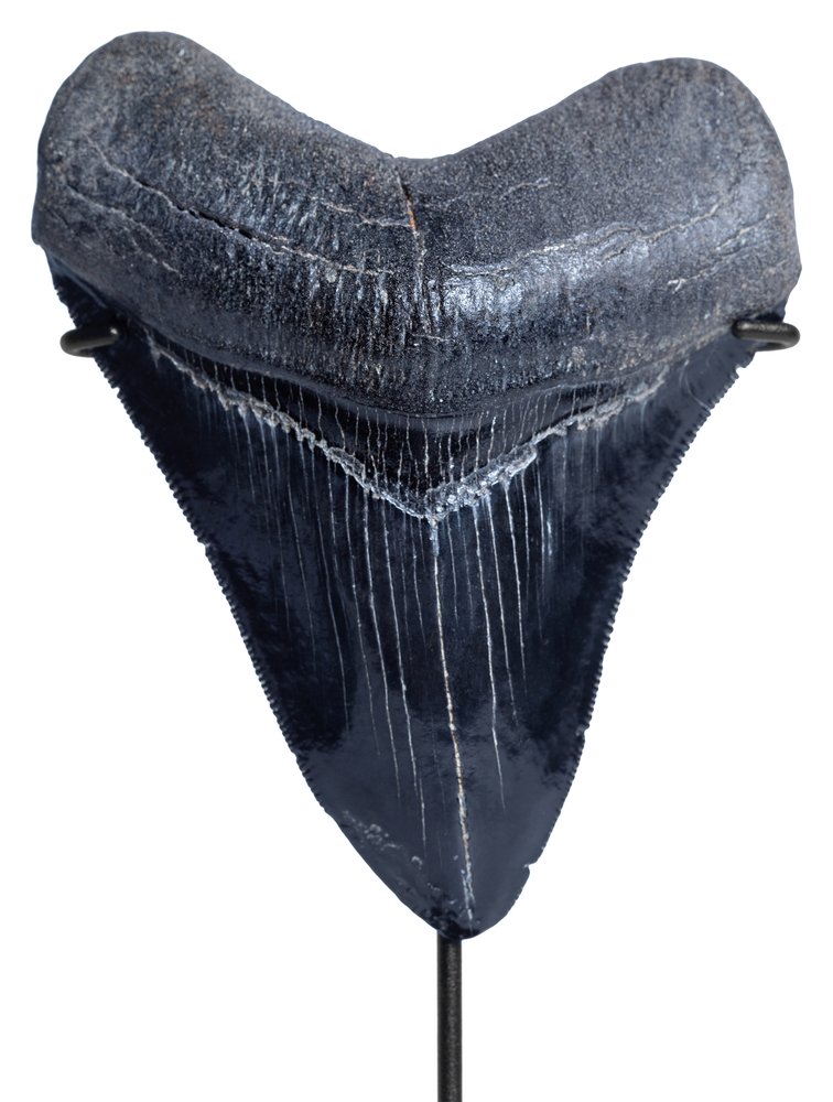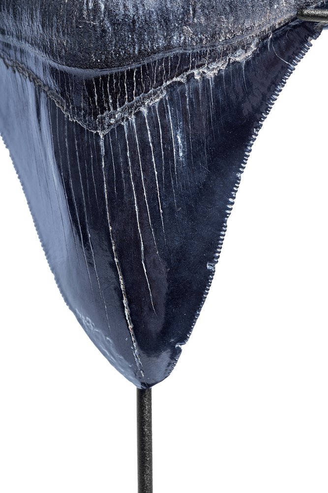 Этот зуб неспроста получил статус образца коллекционного качества. Крупные размеры и массивность уже привлекают внимание. Сохранность практически идеальная. Поверхность зуба не несет никаких повреждений. Пилообразная кромка не содержит значительных дефектов. В довершение картины – окраска, придающая зубу эстетическую привлекательность.