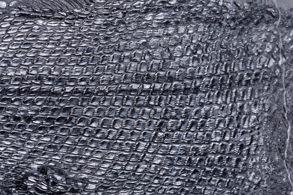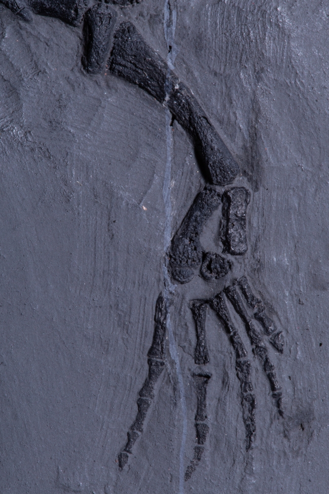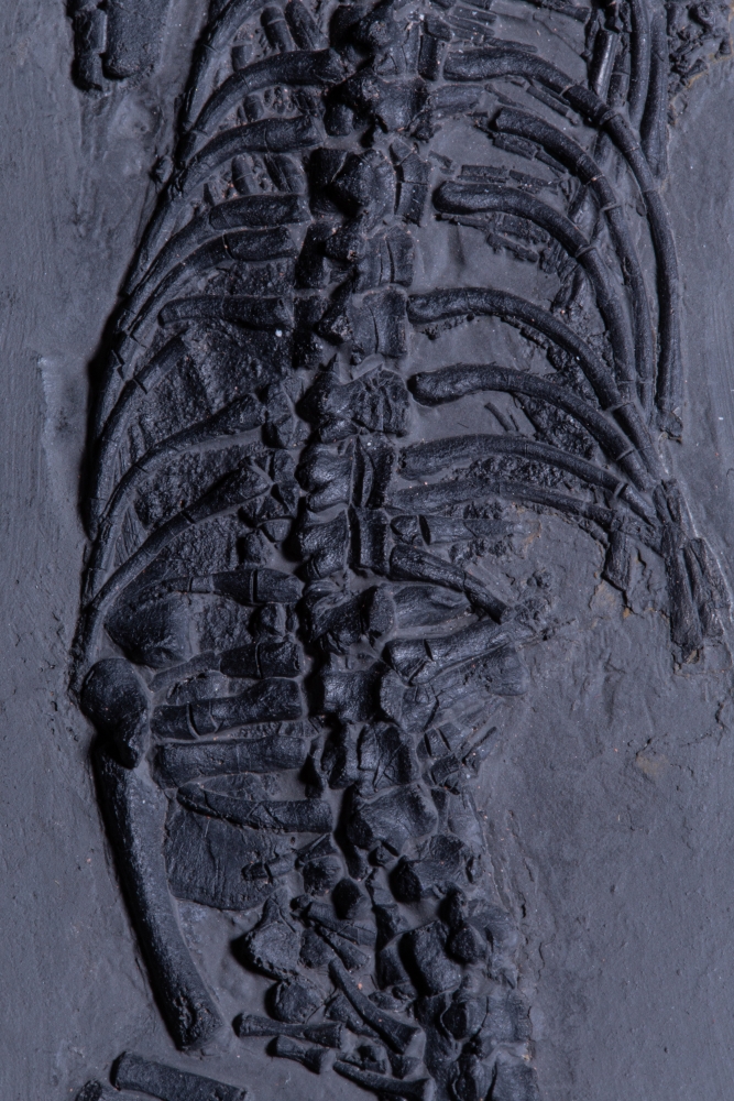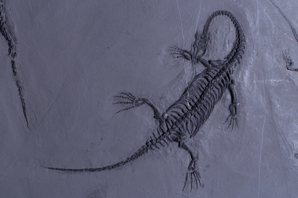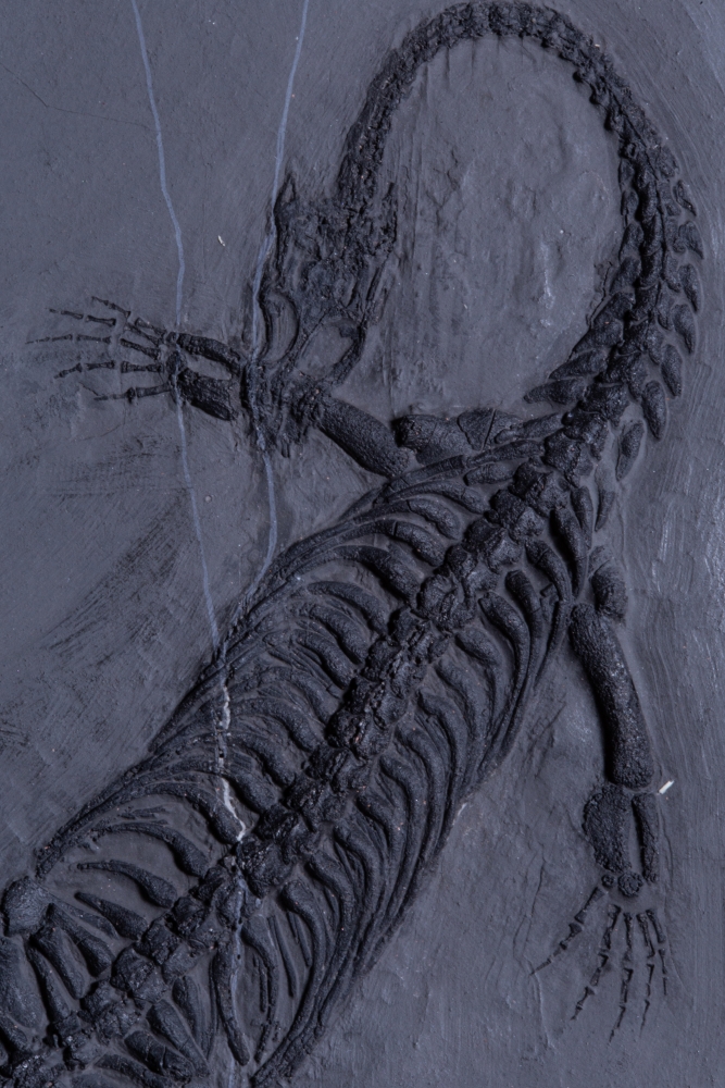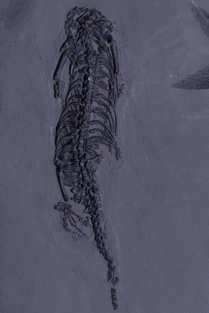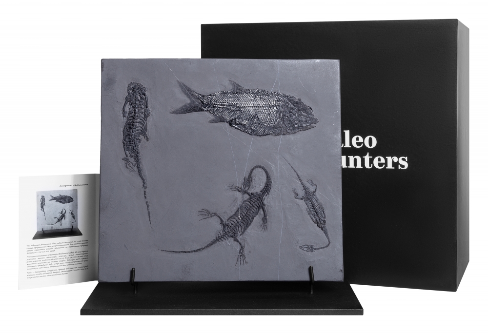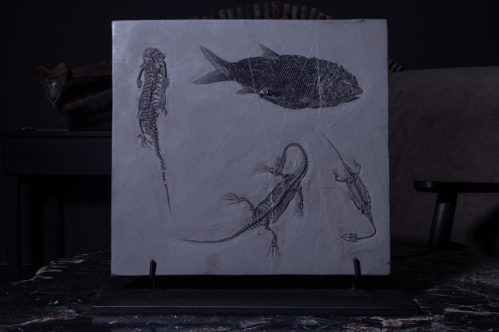 Три небольшие рептилии и одна рыба разместились на серой плитке сланца, сформировав законченную композицию. Это жители морской лагуны триасового периода, обитавшие на территории будущего Китая 237 – 242 млн лет назад.