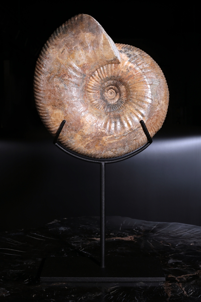Природа воплотила в раковине, ставшей окаменелостью, такое соотношение частей и целого, которое человек позже откроет и назовёт золотым сечением. Спираль плавно расширяется, завораживая взгляд и создавая ощущение идеального равновесия. Тёплый персиковый оттенок раковины и лёгкий отблеск перламутра придают находке почти ювелирное очарование.
