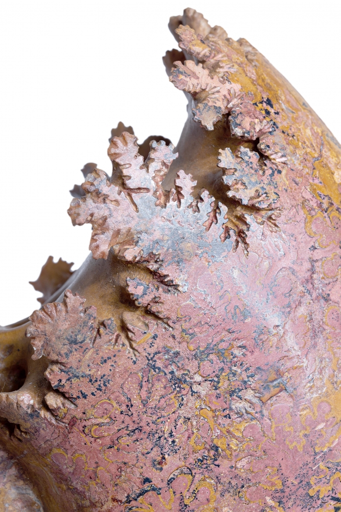 Раковины пахилитоцерасов округлые, тяжеловесные, без ярко выраженного рельефа. Они окрашены в мягкие тона: персиковый, оранжевый, розовый. Если присмотреться внимательнее, можно увидеть красивый узор лопастной линии на поверхности раковины. Сложно поверить, что этот узор образован краями внутренних перегородок раковины, настолько он сложен. Но посмотрите на широкую часть раковины – здесь перегородка расчищена препаратором и предстает перед нами во всей красе, с листовидными краями и плавным изгибом в центре.
