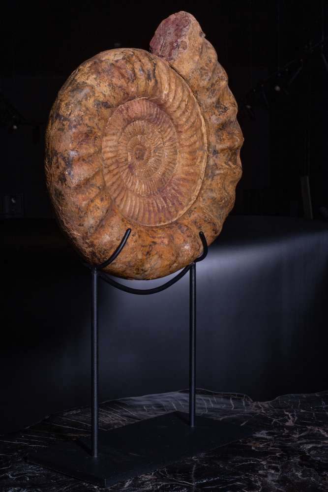 Оранжевая окраска с участками розового цвета говорит о замещении раковины кальцитом. Спираль раковины производит впечатление очень плотной, выраженные поперечные ребра создают красивый узор, напоминающий лучи солнца. Это прекрасный природный арт-объект, который будет хорошо сочетаться с большинством интерьерных стилей.