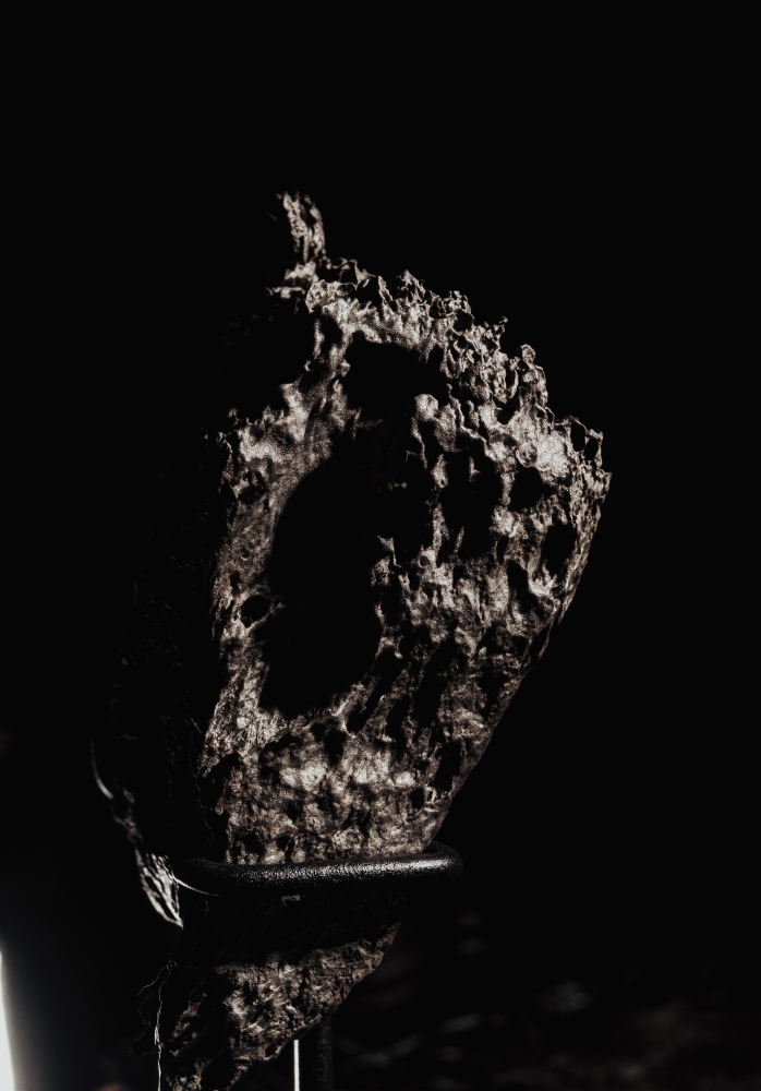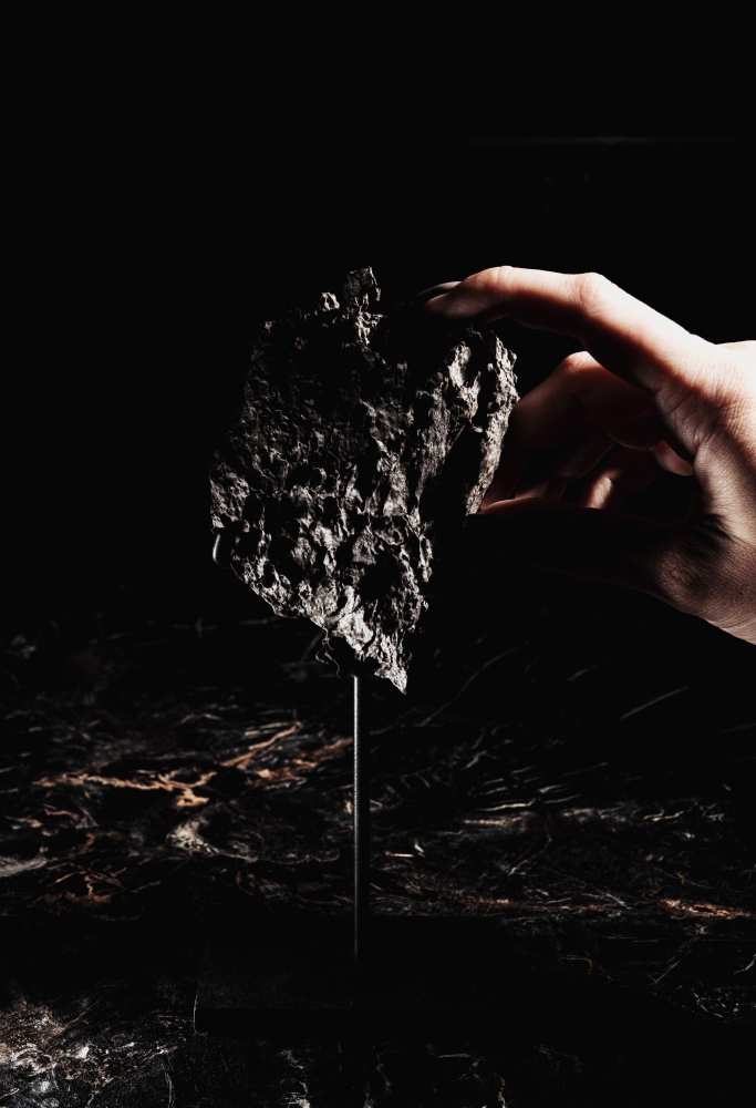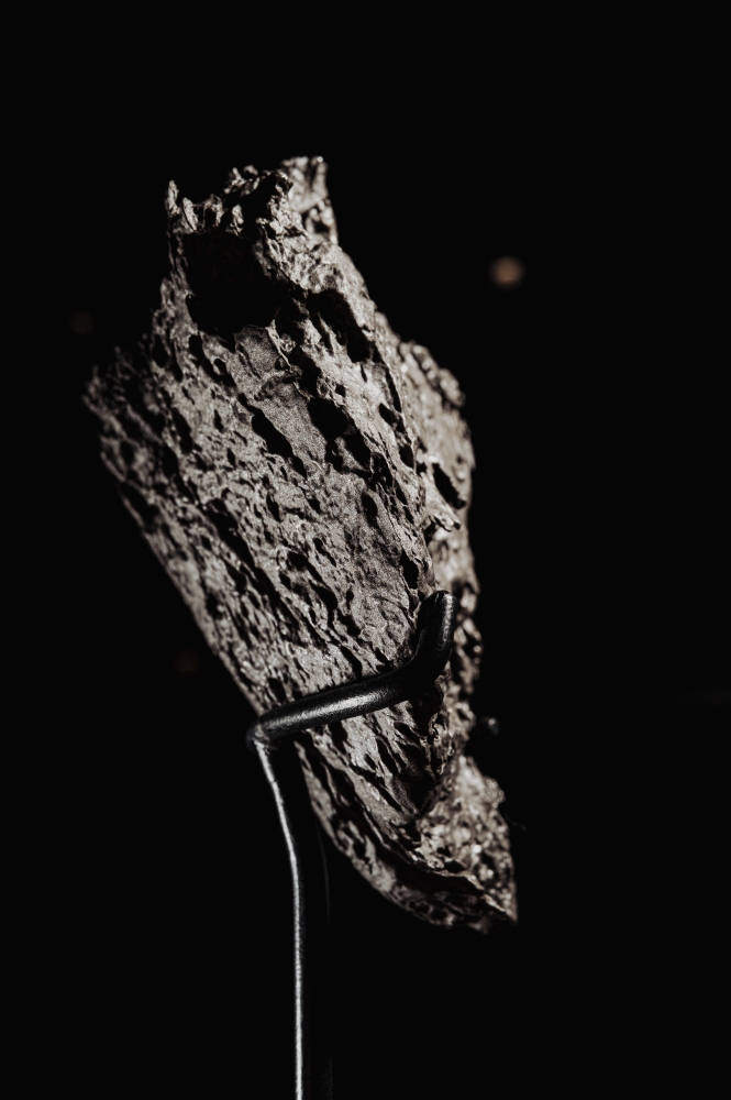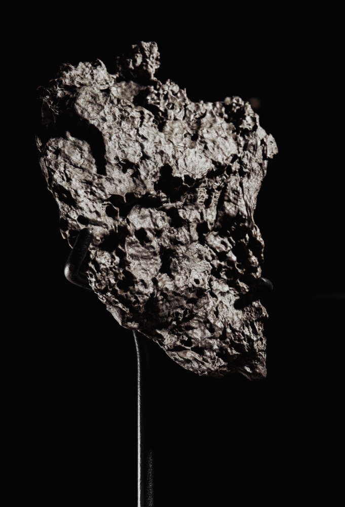 Этот образец, как и многие другие обломки, образовался при столкновении метеорита с земной поверхностью. Об этом говорит его неправильная форма и острые, рваные края. Поверхность обломка имеет заметную кору плавления. Металл образует многочисленные вмятины, наплывы, углубления и потеки – можно догадываться о том, до каких температур был разогрет этот кусок метеорита при столкновении с Землей.