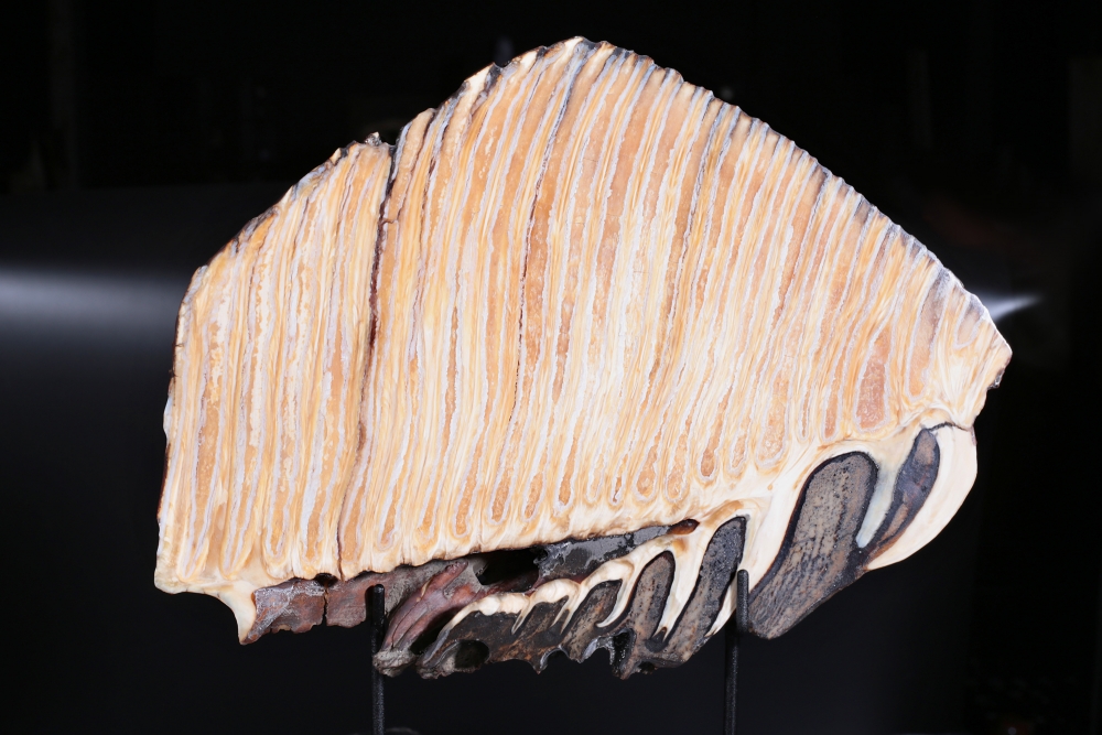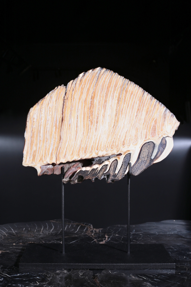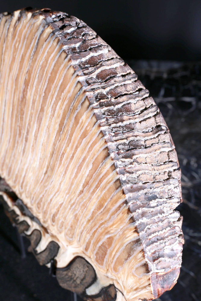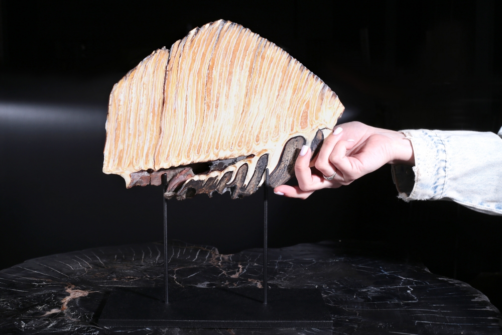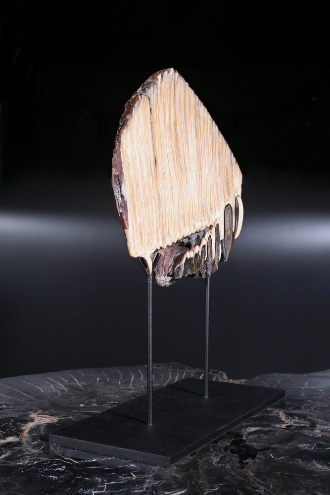 Как правило, в качестве декоративных предметов, зуб мамонта используется в целом виде. Такие образцы, как наш, распиленные вдоль, встречаются реже. Это связано с неоднородной структурой зуба, которую трудно обрабатывать. На спиле видно, как полосы твердой эмали проходят «волнами» через всю костную ткань зуба. Такое строение делает зуб устойчивым к нагрузкам. Ведь в день мамонт съедал два-три центнера травы с кустарниками.