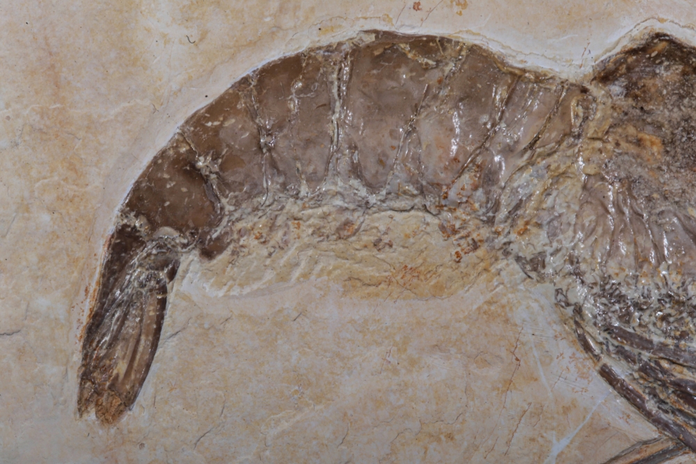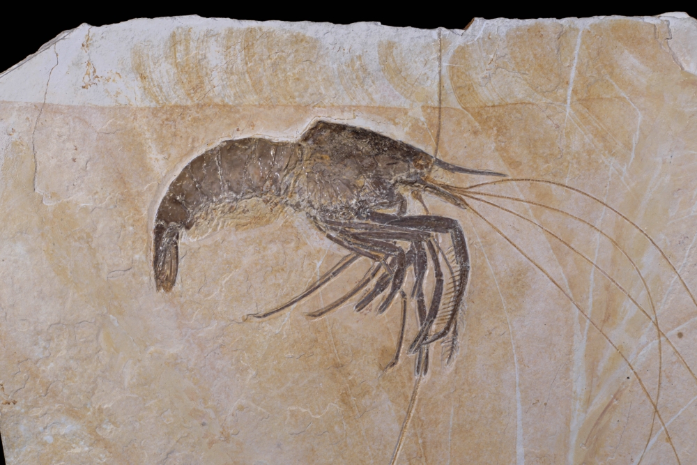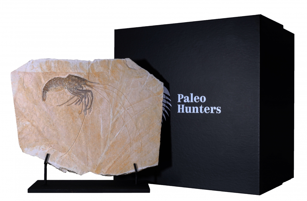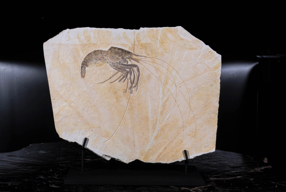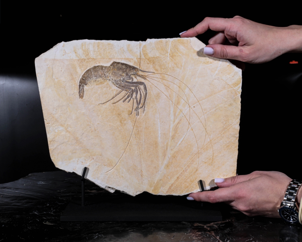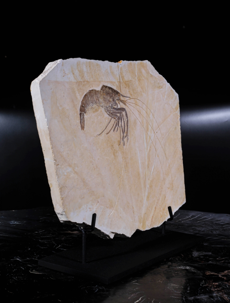 Эта изящная окаменелость – древняя креветка из рода Aeger, обитательница юрских морей, населявшая лагуны Зольнхофена. Её тонкие клешни, антенны и членистое тело сохранились с редкой точностью, вплоть до мельчайших сегментов и изгибов, словно она замерла в прозрачной воде всего на миг.