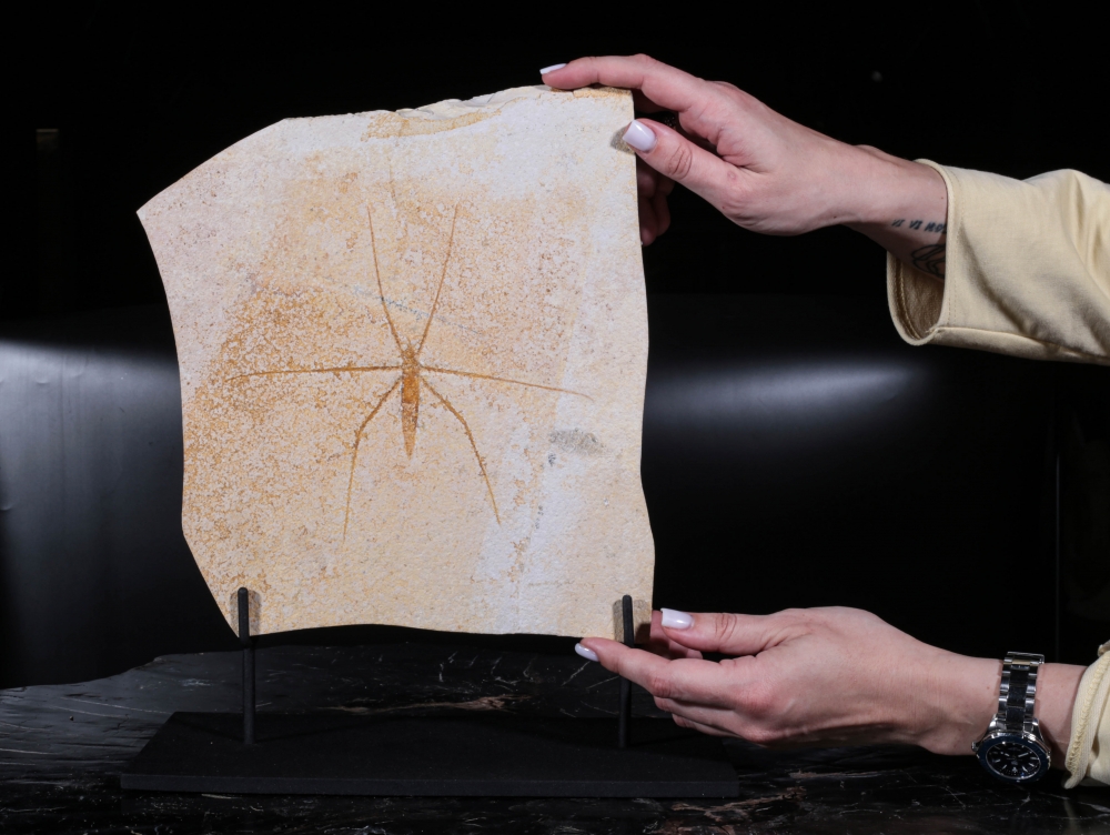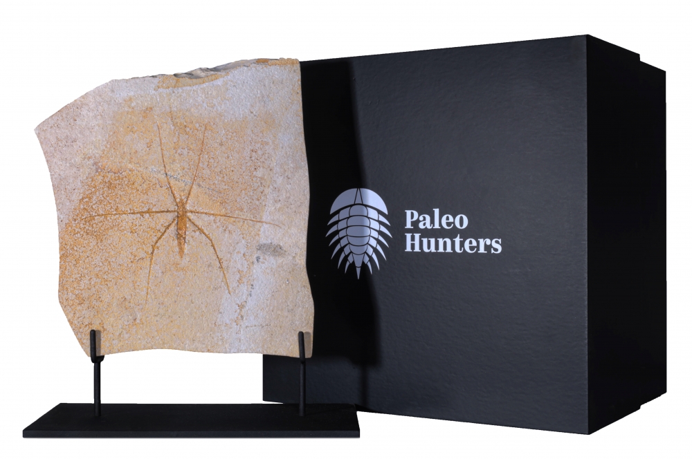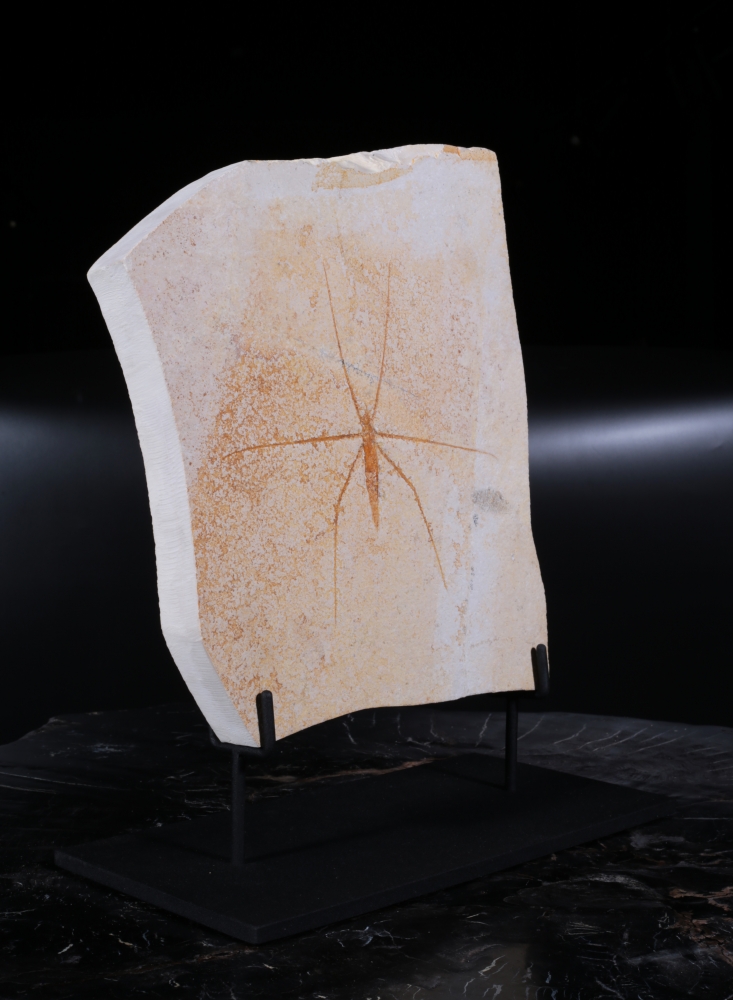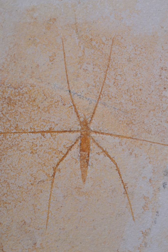 Окаменелость поражает степенью сохранности: видны контуры тела, членистые тонкие ноги. Светлый известняк подчёркивает хрупкую архитектуру силуэта, превращая окаменелость в произведение геологического искусства.