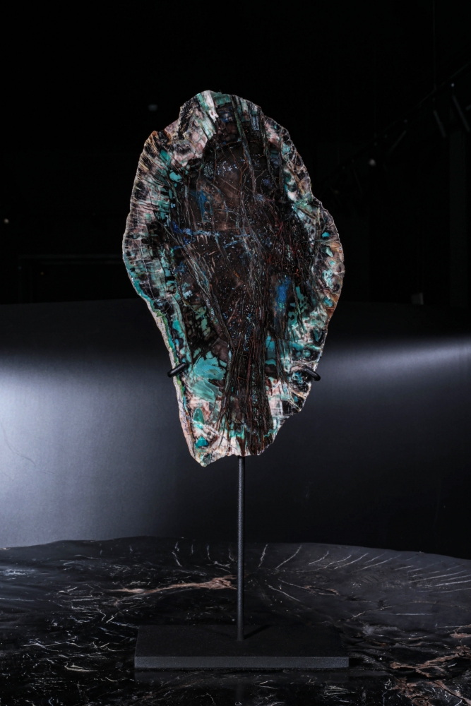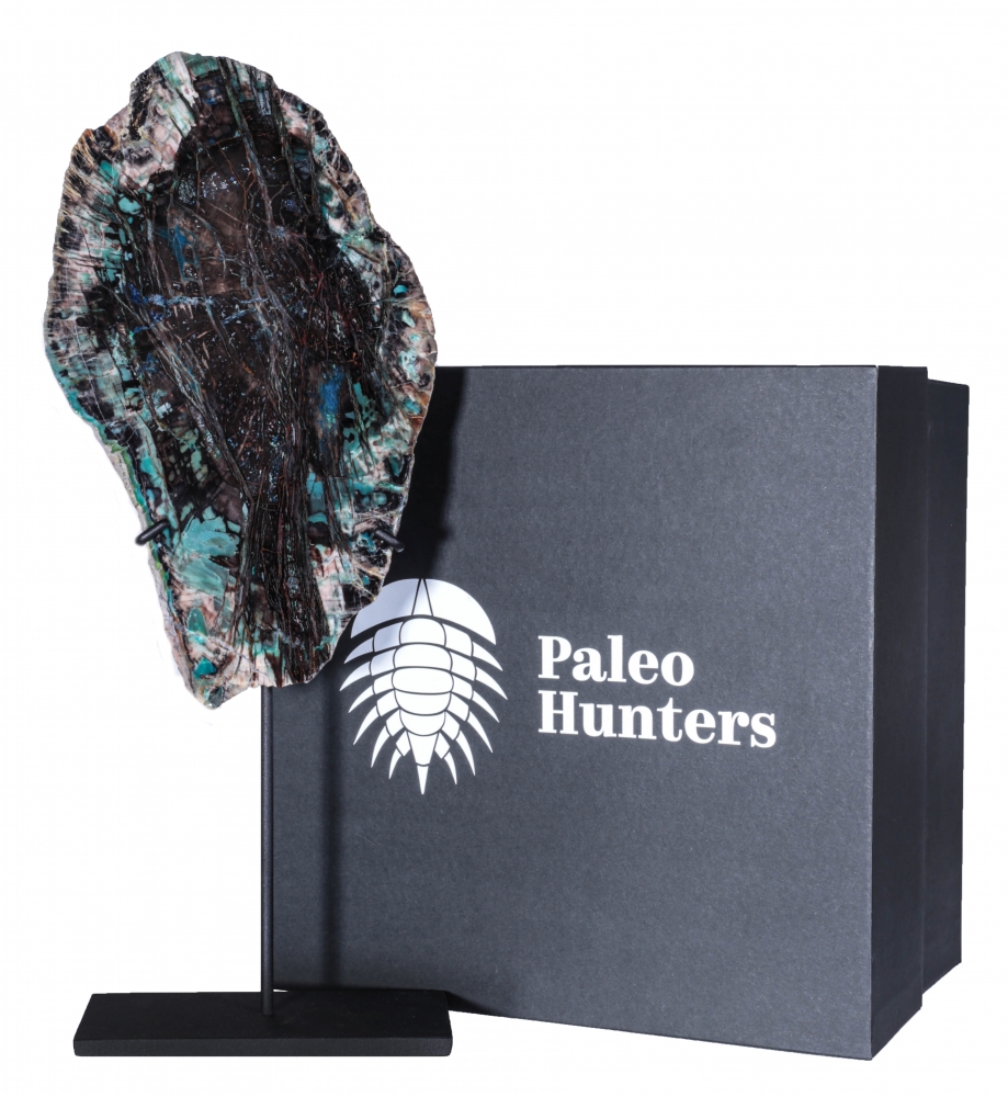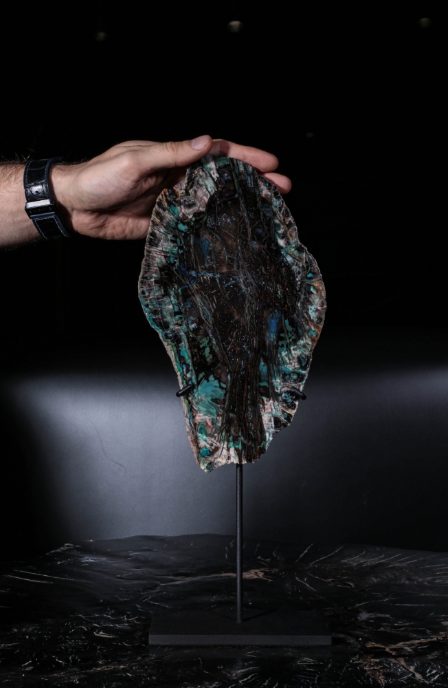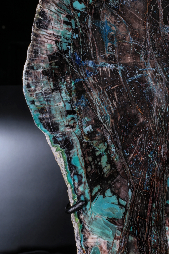 Перед вами спил окаменевшего дерева, относящегося к категории Colla wood: так называют древесину, чьи ткани полностью замещены соединениями меди. Классифицировать дерево в таком случае уже невозможно из-за особенностей фоссилизации. Зато можно наслаждаться его необыкновенной красотой.