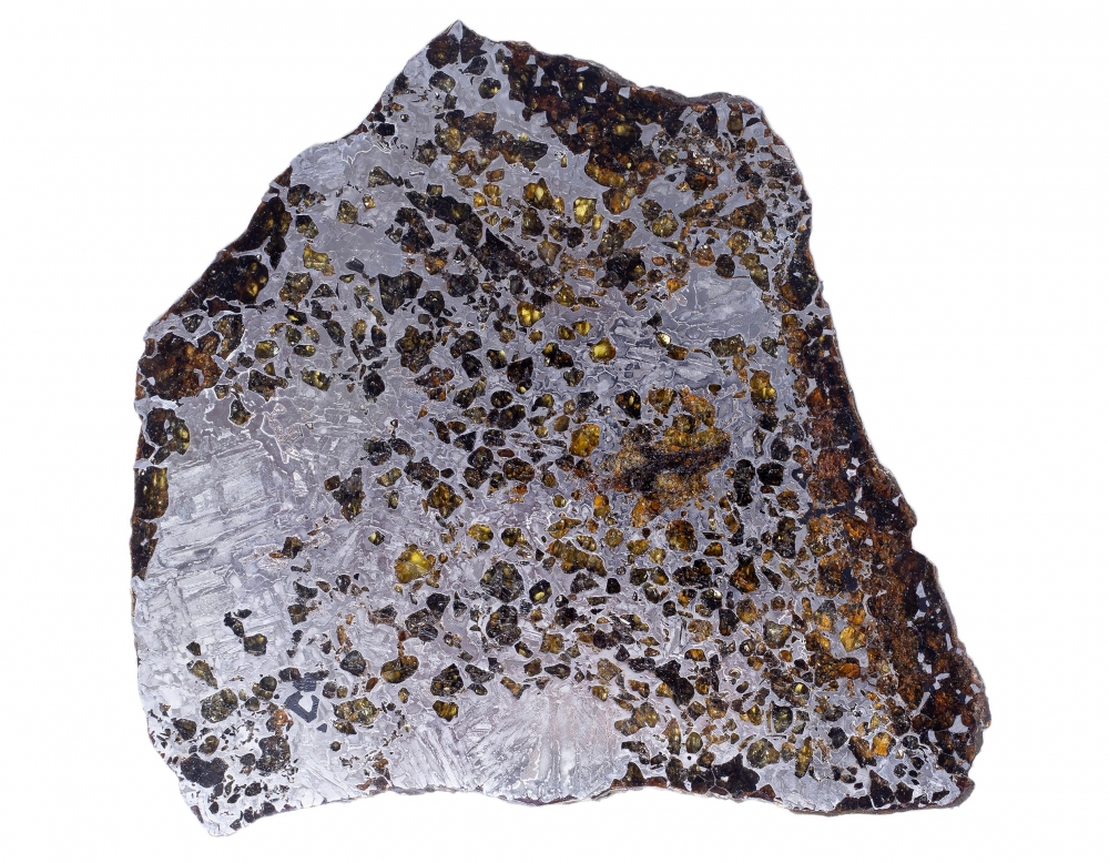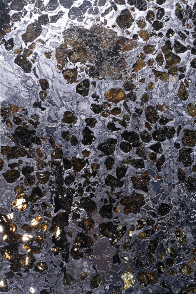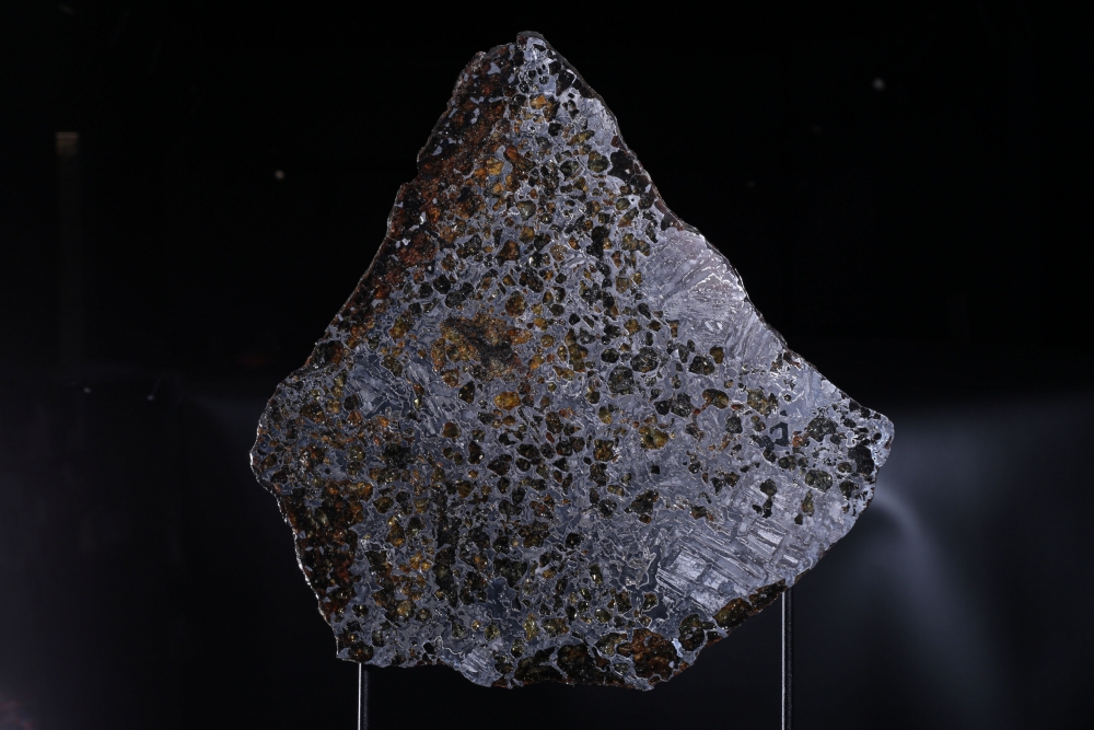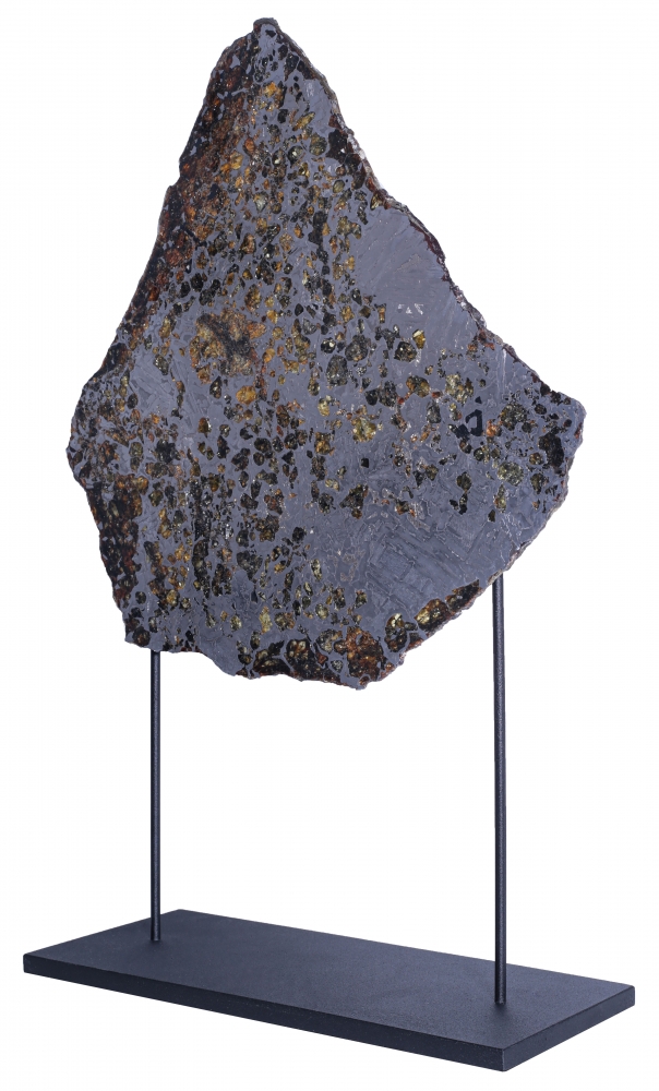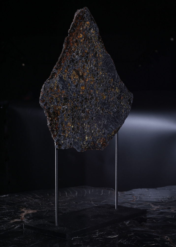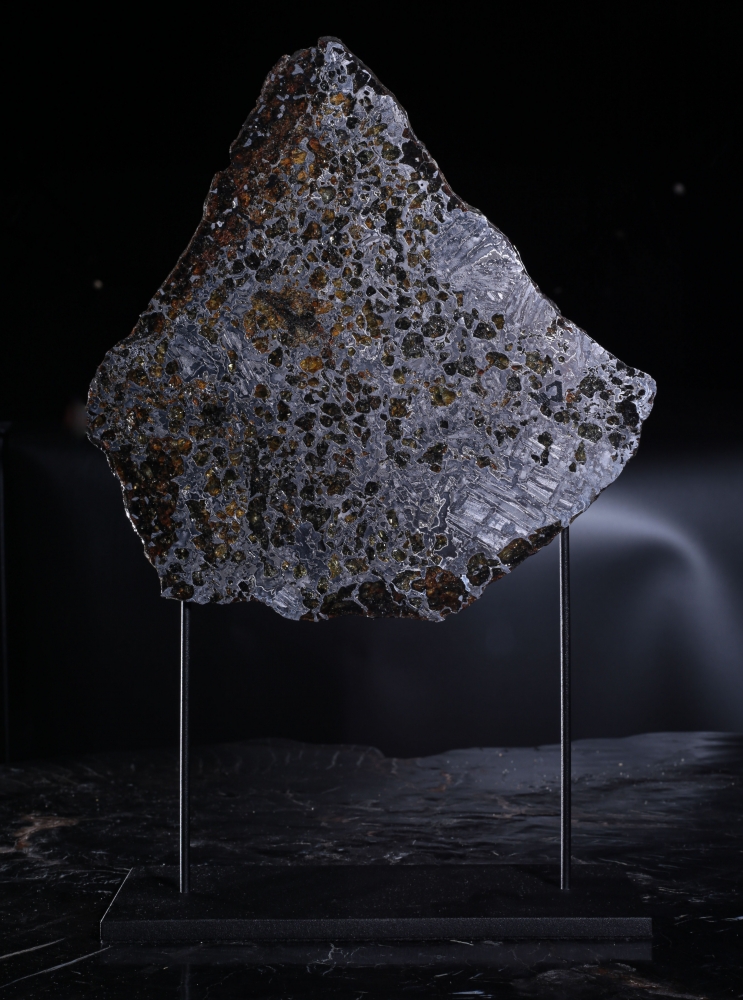 Пластина метеорита Сеймчан, относящегося к редкому классу палласитов. Его необычная структура образована сложным соединением железной матрицы и золотистых кристаллов оливина. На металлических участках можно заметить узор из видманштеттеновых линий. Это следы кристаллизации металла в условиях космоса. Красота пластинки метеорита особенно заметна на свету, когда яркие блики переливаются в оранжево-желтых оливиновых включениях.