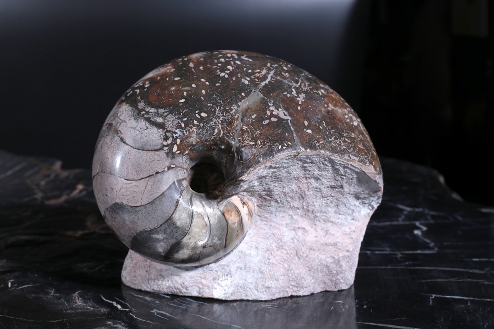 Наутилусы – это головоногие моллюски, обитающие на нашей планете с палеозойской эры. Их внешний вид напоминает более известных аммонитов. Но, в отличие от аммонитов, наутилусы сохранились до наших дней, являясь настоящими живыми ископаемыми. Раковины наутилусов в виде окаменелостей встречаются редко и ценятся достаточно высоко. Данный экземпляр обладает приятной окраской и будет хорошо смотреться в интерьере.