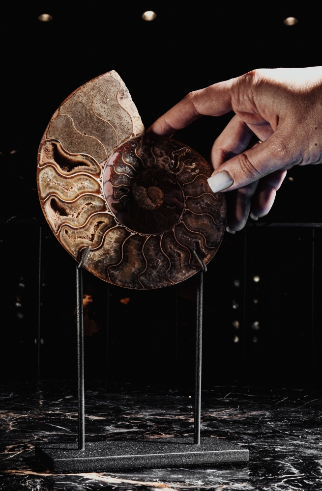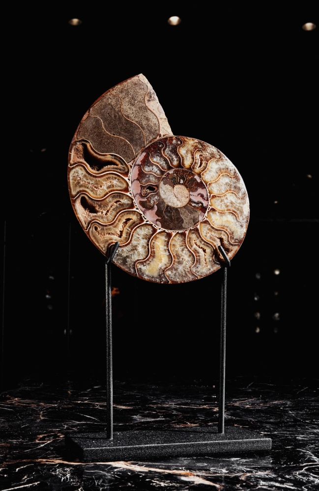 Их раковины были замещены кальцитом, способным окрашиваться в самые невероятные цвета под действием прочих минералов. Основной цвет мадагаскарских аммонитов – янтарно-рыжий, но поверх него накладывается листообразный узор лопастных линий. Раковины становятся похожи на произведения искусства, покрытые затейливым орнаментом. Установленные на изящную подставку, они отлично впишутся в ваш интерьер.