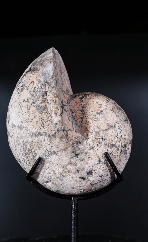 У аммонита из рода Paracladiscites округлая, почти сферическая раковина, по пропорциям похожая на раковину наутилуса. Характерная для аммонитов сложная лопастная линия образует на поверхности причудливый узор, похожий на папоротниковые листья. Этот узор – след перегородок, разделявших внутренние камеры в раковине аммонита.